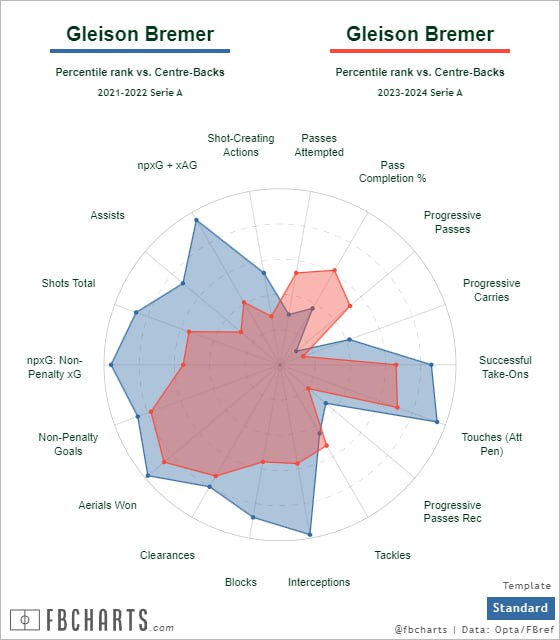 Беглого взгляда на сравнительную статистику хватит, чтобы уловить противоречие: цифры сезона 2021/22 впечатляют больше нынешних. В действительности несостыковок здесь нет: на фоне центрбэков «Интера» в этом сезоне меркнут показатели абсолютно всех игроков обороны. Тем не менее, отмечаем рост показателей вовлечённости в позиционку – тут бразилец зримо спрогрессировал. Будь защитная линия Аллегри чуть выше, мы бы увидели и положительную динамику в метриках Progressive Carries и Progressive Passes Rec. Впрочем, эту страницу Глейсон перевернёт уже в обновлённом «Ювентусе», а до него рукой подать.
