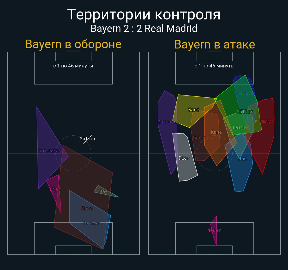 Одно из главных впечатлений по первому тайму матча в Мюнхене – большие объёмы покрытого пространства от Кейна. Видно, что Харри детально оговаривал с Тухелем свой функционал в базовом сценарии, где он будет постоянным подстраховщиком центрбэков в фазе без мяча – фактически ложным опорником. Вероятно, Томас хотел, чтобы Кейн действовал по лекалам осенних матчей (с «Вердером», «Гладбахом», «Байером»), когда его среднее время присутствия на своей половине примерно в 1,5–2 раза превосходило цифры на чужой. В тех играх нападающий также сам разгонял атаки, а потом их завершал; был лидером по передачам с продвижением. Конечно, против «Реала» от него требовалась лишь демо-версия тех свершений.