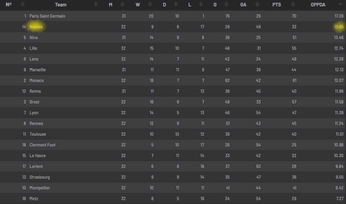 60-летний специалист вернул коллектив на привычные рельсы: этот сезон «Нант» доедет с двойкой ЦЗ и парой страхующих опорников. Кроме того, «канарейки» пока не расстались со своей характерной чертой – почти непринуждённым выходом из-под прессинга, преимущественно высокого. В среднем соперник позволяет жёлто-зелёным сделать 13.65 передач до отбора. Это больше, чем у «Ниццы» Фариоли (13.46) и «Лилля» Фонсеки (12.74). Как итог, «Нант» имеет второй показатель OPPDA в чемпионате.