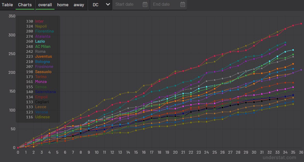 Кстати, мы уже прибегали к помощи DC в феврале, когда оценивали игру «Болоньи» и «Фиорентины». Ещё тогда было видно, как сильно «фриульцы» отстают от других коллективов, однако увязывать низкие показатели DC с xG и xGA на тот момент было рано – сейчас же в самый раз. По ожидаемым забитым голам «Удинезе» идёт 13-ым, по ожидаемым пропущенным – 9-ым, по прогнозируемым набранным очкам – 11-ым. Словом, до трясины таблицы далековато. Однако цифры DC у «фриульцев» плачевные – лишь 116 за 35 туров, и это, разумеется, последнее место.