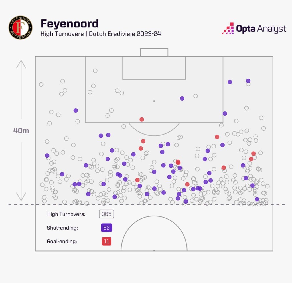 Что касается high turnovers (овладение мячом в пределах 40 метров от ворот соперника), то и здесь Слот уступает коллегам по АПЛ самые крохи. В частности, Клоппу всего на 16 пунктов: у его парней в сезоне 381 возврат, 68 ударов после перехватов; подопечные Арне сделали 365 high turnovers и 63 раза после этого пробили, настреляв так 11 мячей.