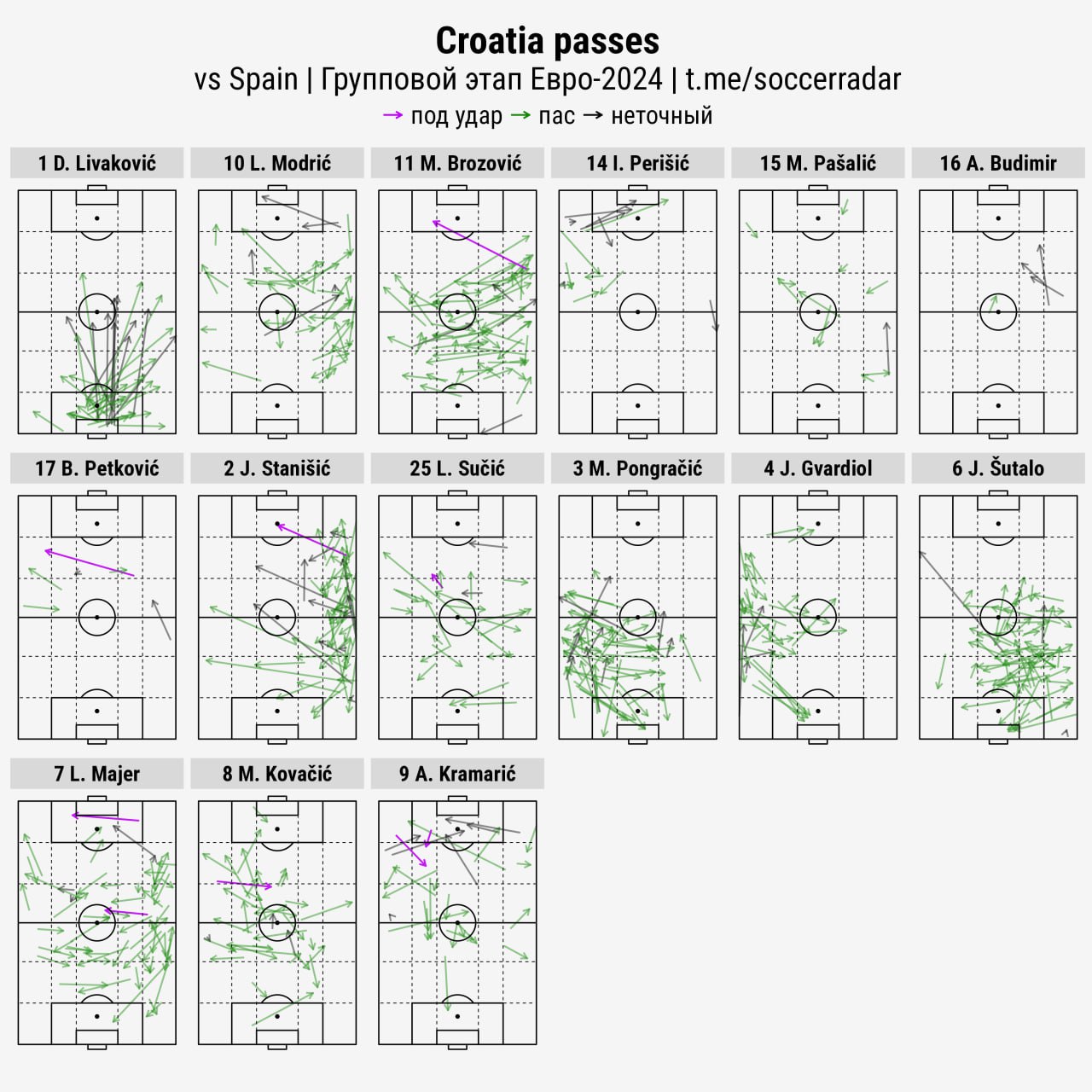 Как известно, хорваты стали первой за 16 лет сборной, прервавшей гегемонию испанцев во владении мячом. Кроме того, подопечные Далича запомнились сильными индивидуальными перфомансами целого ряда игроков – Станишич, например, совершил 5 возвратов владения, а также сделал 4 умные передачи с продвижением; Ковачич впечатлил смелым дриблингом (в том числе в переходных фазах), совершив 4 успешные обводки. Впрочем, точечные индивидуальные решения вряд ли могли помочь хорватам одолеть испанцев, учитывая а) общую стерильность «шашечных» во владении б) бенефис Унаи Симона.