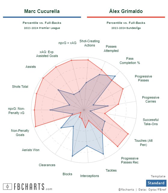 И всё же, почему он, а не Гримальдо? Есть мнение, что Алекс сильно тянул бы одеяло на себя, лишая мяча главного творца испанской феерии – Нико Уильямса. Этот тейк имеет место, учитывая хотя бы атипично высоко задранную позицию латераля: в «Байере» он часто действует выше тройки под нападением, но в сборной такие действия – неформат, губящий баланс на левом фланге. Если произвести кластеризацию действий Гримальдо, то станет очевидно, что он самый атакующий, маневренный и эффективный с точки зрения созидания крайний защитник в мире. Однако слово «защитник» здесь не случайно выглядит инородным: трансформация Алекса по ходу розыгрыша 2023/24 дошла до того, что к весне он вообще был избавлен от оборонительной работы, под занавес сезона став чуть ли не вингером (в финальных играх ЛЕ он даже числился таковым в протоколе).