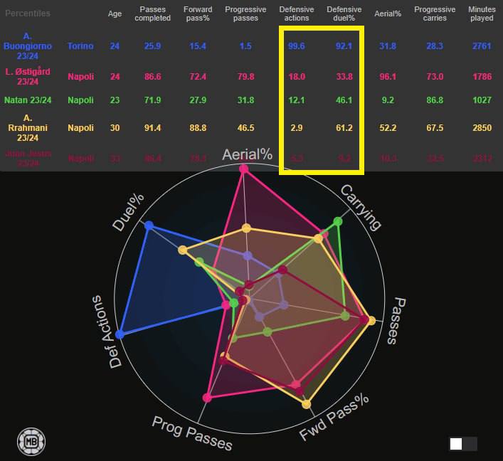 Алессандро отправится прямиком к Конте - в совершенно иную систему координат и, разумеется, ни разу не идентичную формацию. Ниже - сравнение ключевых показателей лучшего центрбэка Серии А с цифрами ЦЗ «Наполи» в сезоне 2023/24. С кем можно достичь оптимальной синергии в центре обороны - вопрос дискуссионный, однако уже сейчас нельзя не отметить потенциальные связки.