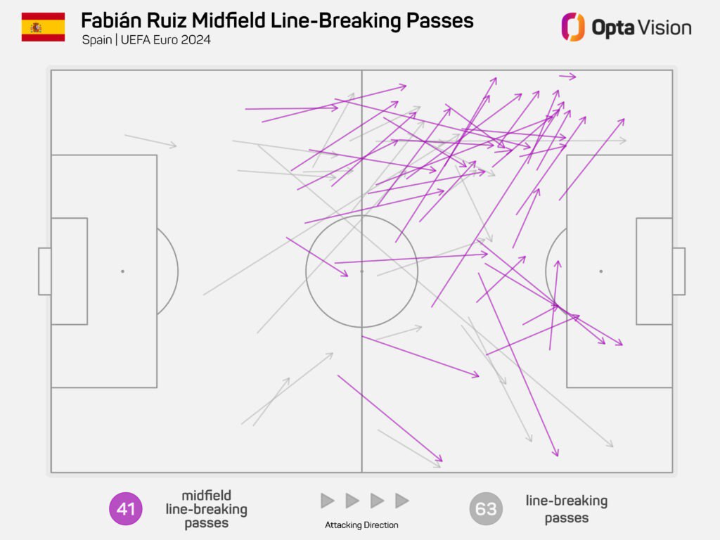 Opta подчёркивает исключительное влияние Фабиана Руиса на успех «La Furia Roja», отталкиваясь от трёх компонент: умении игрока ситуативно свапаться с любым партнёром в центре/на левом фланге, системообразующей роли Фабиана в билд-апе и разрезающих передачах «восьмёрки» парижан, коих у него, к слову, больше, чем у Родри.
