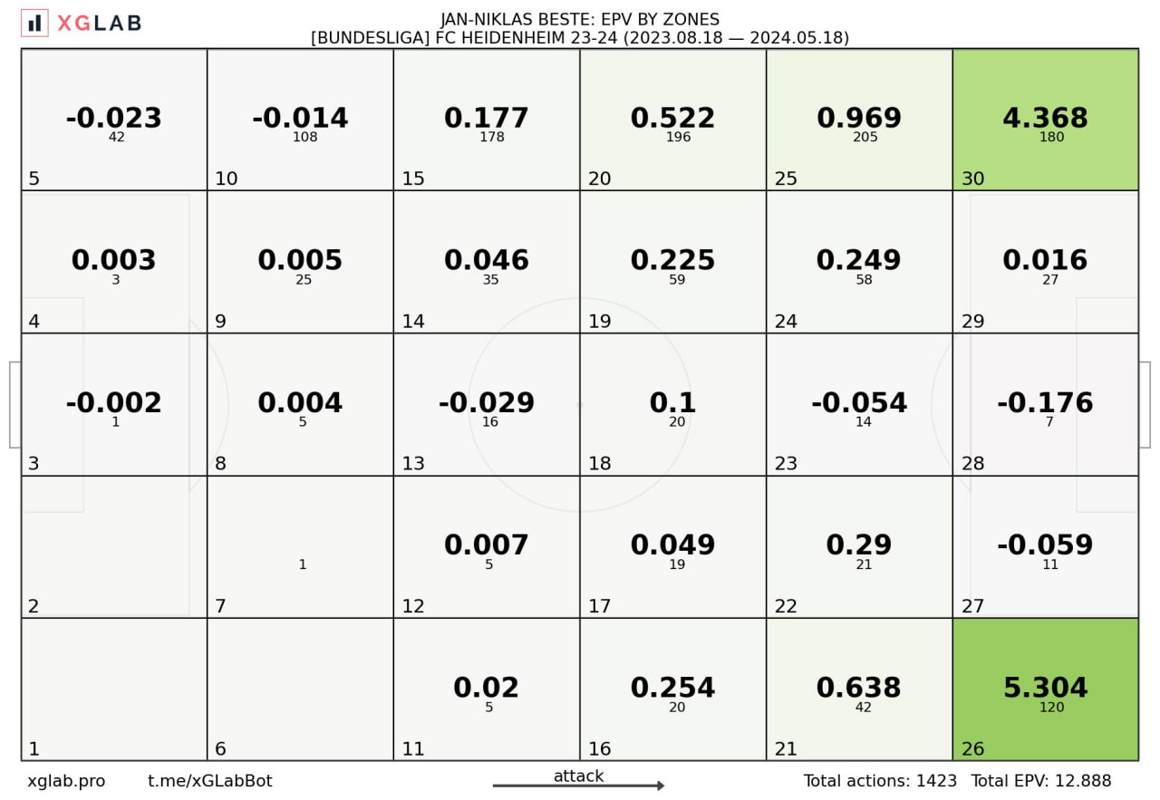 Напоследок немного о possession skills Бесте. По правде говоря, я не мониторил показатели Яна с тех самых пор, как дал на него рецензию в январе. Зря. Оказалось, что фронтмен «Хайденхайма» обошёл Гримальдо под занавес сезона по EPV: у Алекса – 10.867, у Бесте – 12.888. Не последнюю роль сыграло умение подавать угловые.