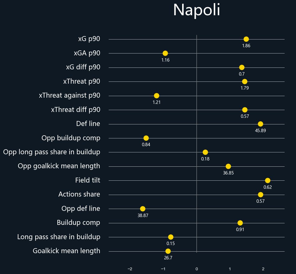 Сейчас, к слову, особый интерес представляют процессы трансформации защитной линии, рисунка билд-апа (продавит ли Де Лаурентис 4-3-3 в качестве основы) и роли Буонджорно, о котором я писал неделю назад: куда определит его Конте и главное – как проработает слабые стороны Сандро (очень плох в качестве архитектора билд-апа). Наконец, вернёт ли Антонио «Наполи» на привычные рельсы? Например, из атипичных особенностей «партенопейцев» в сезоне 2023/24 особняком стоят две: уменьшение числа лонгболов в позиционных атаках (заметное снижение по медиане) и увеличение наклона поля (ещё более заметное отклонение от среднего по палате). Думаю, именно в этих метриках откат произойдёт быстрее всего.