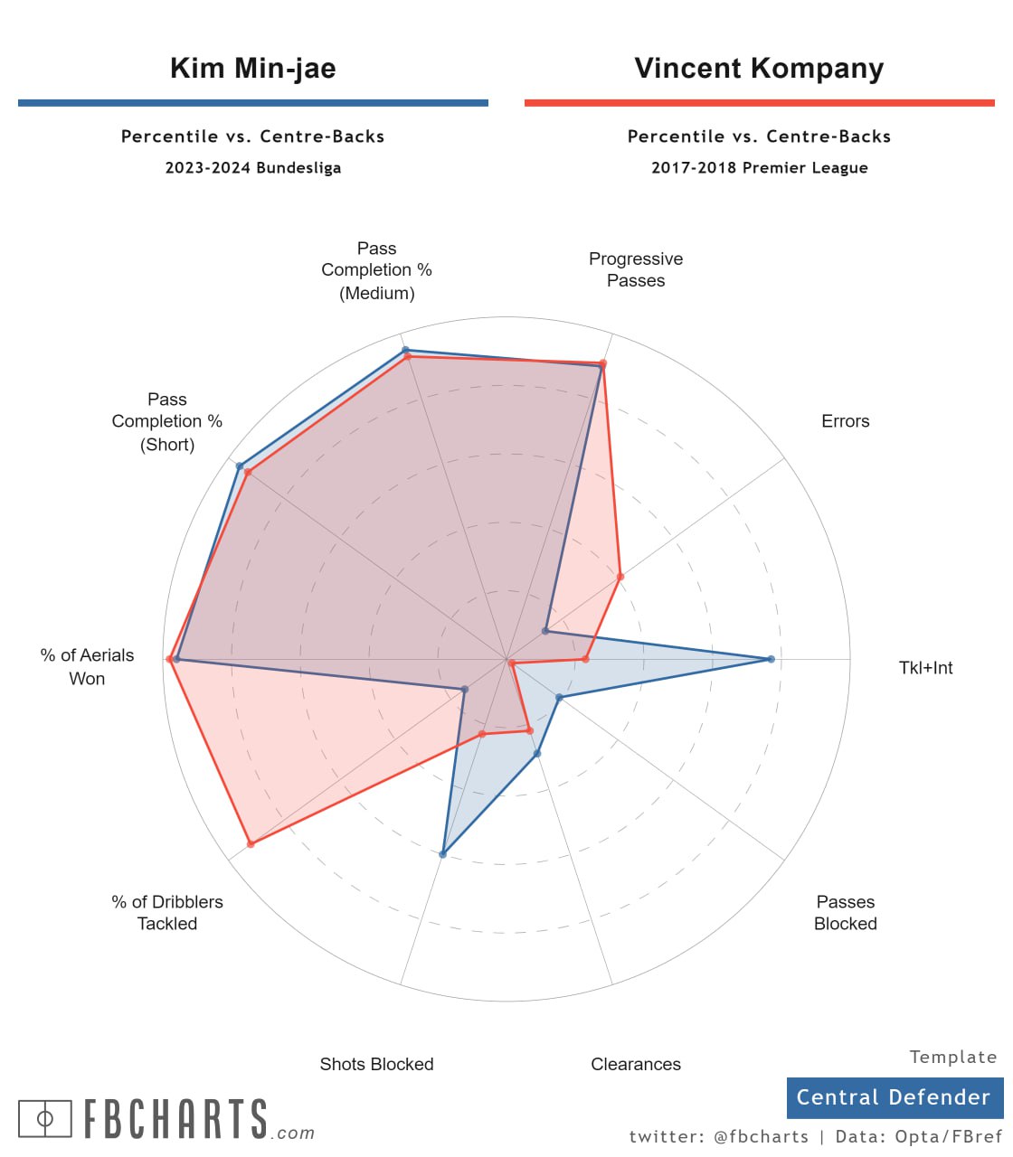 В связи с высказыванием Кима, а также тем, что обороне мюнхенцев в эту предсезонку уделяется не меньше внимания, чем перестройке в полузащите, решил попробовать экспериментальный формат: взять один из сезонов Компани-игрока на закате карьеры (с поправкой на то, что тогда он провёл в АПЛ лишь 17 матчей) и наложить его на дебютный отрезок Мин Джэ в «Баварии». По крайней мере, подобная визуализация позволяет понять а) о чём говорит кореец; б) какими игровыми принципами руководствовался Венсан-футболист; в) насколько Ким соотносится с игровыми лекалами своего нового наставника.