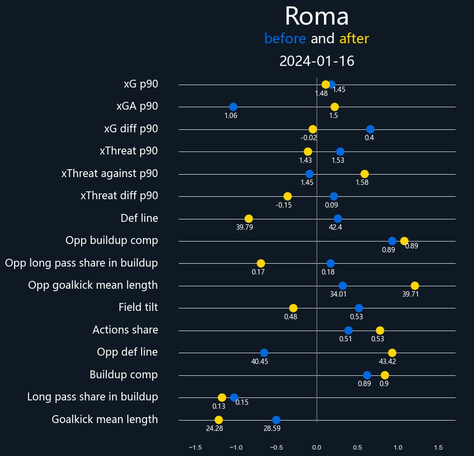 Судя по текущей трансферной кампании, проводящейся с сильным креном в сторону атакующей группы, Де Росси продолжит реконструировать футбол родного клуба в привычной манере: постарается купировать дефицит надёжности позади голевым профицитом впереди. Интрига заключается лишь в способности преодолеть этот разрыв – как видно из инфографики прошлого сезона, цифры Даниеле даже в созидательных метриках были похуже, чем у Особенного.