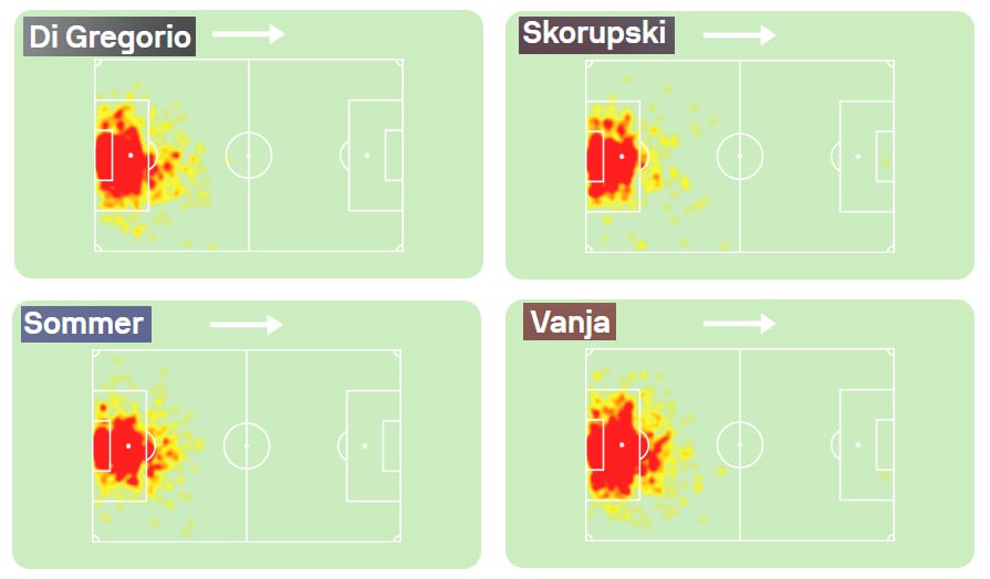🇮🇹 Как известно, сезон 2023/24 стал для Зоммера (сейвов в среднем – 2.4) почти формальностью. Это отразилось и на его плейстайле. Яну редко приходилось прибегать к лонгболам, а мяч от ворот «Интера» чаще продвигали латерали или центрбэки. Как итог, тепловая карта швейцарца ограничивается пределами первой трети. В «Баварии» бы такого не поняли.