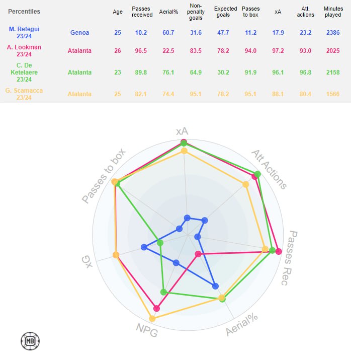 Не уверен, что голевые успехи Ретеги стоит оценивать в отрыве Гудмундссона – всё-таки созависимость тут налицо, её глупо отрицать. Cложно представить, что альтернативу своему симбиозу с исландцем Матео найдёт здесь – в «Аталанте». В их связке с Альбертом многое зависело от действий скандинава на пространстве и умения обоих подменить друг друга позиционно, если к этому склоняла ситуация. Оптимального форварда пространства у «бергамасков» сейчас нет, и более того – именно Ретеги призван заменить его на ближайшие полгода. Что до ситуативных свапов, довольно сложно представить, с кем в отсутствие Миранчука Матео достигнет соизмеримого уровня взаимопонимания: с Лукманом точно нет, с Де Кетеларе – возможно, но не гарантированно.