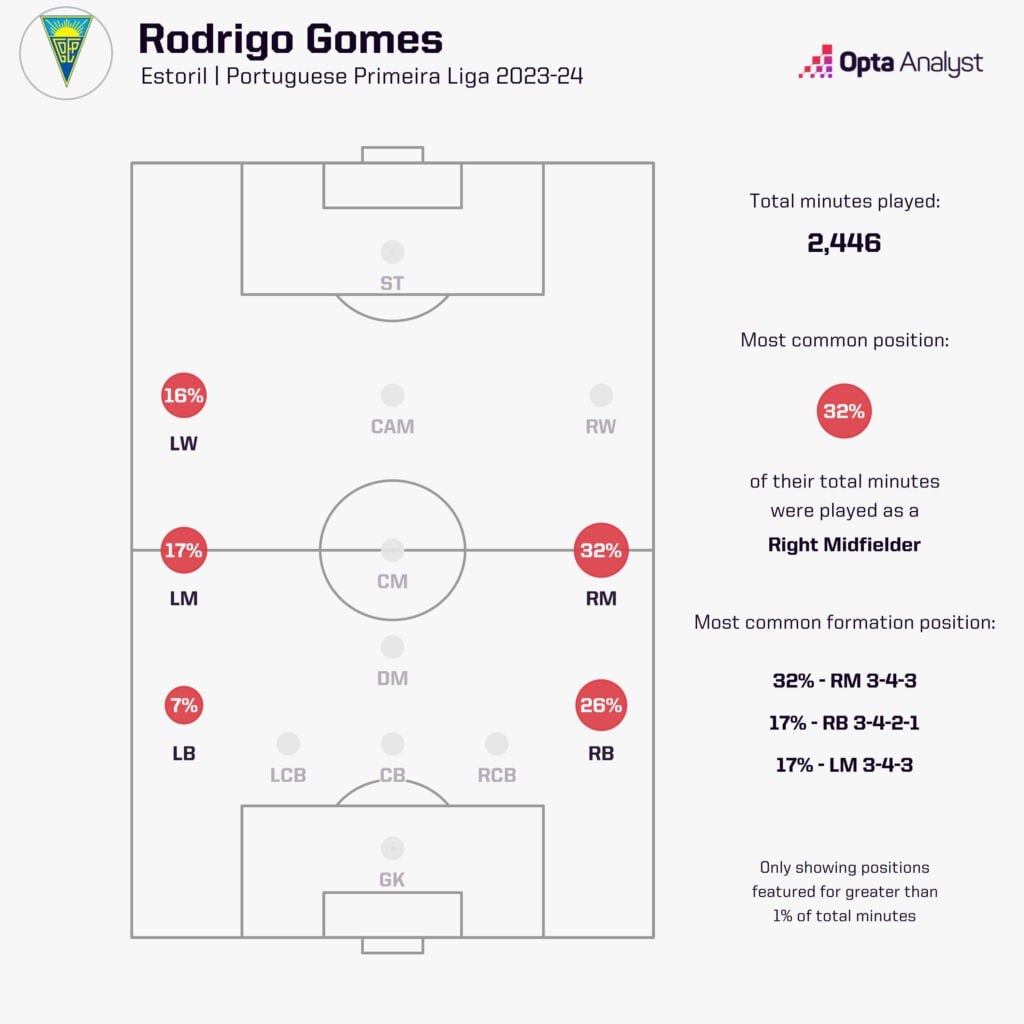 Часть сезона Родригу провёл на левом фланге, являясь природным правшой. То есть, фактически исполнял роль инвертированного латераля/вингера, пускай и с незначительной потерей в качестве. Перевод направо позволил ему раскрыться в новом качестве – в амплуа взрывного бровочника, принимающего разрезающие передачи партнёров (что-то вроде Беллановы, но ещё острее). Сезон Гомеш завершил с показателями 7+7 – никто из футболистов младше 21 года не выдал в португальской лиге подобного перфоманса.