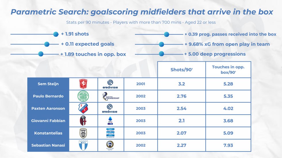 В Driblab красиво завуалировали методику конструирования выборки по самым результативным и при этом юным треквартистам, назвав это «параметрическим поиском». Входные данные следующие: