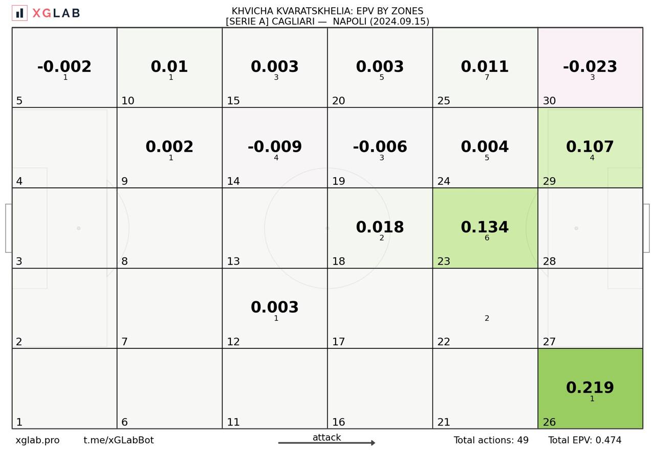 Несмотря на смазанные с точки зрения сыгранности с партнёрами стартовые два тура, совокупные нон-шот показатели Хвичи «выросли в цене» (2 слайд). Отрицательные значения EPV грузина остаются только в зонах, которые он делит с Лоботкой, да и то лишь в силу специфики владений (здесь Кварацхелии объективно сложно принимать решения на мяче + выше риск потерь).