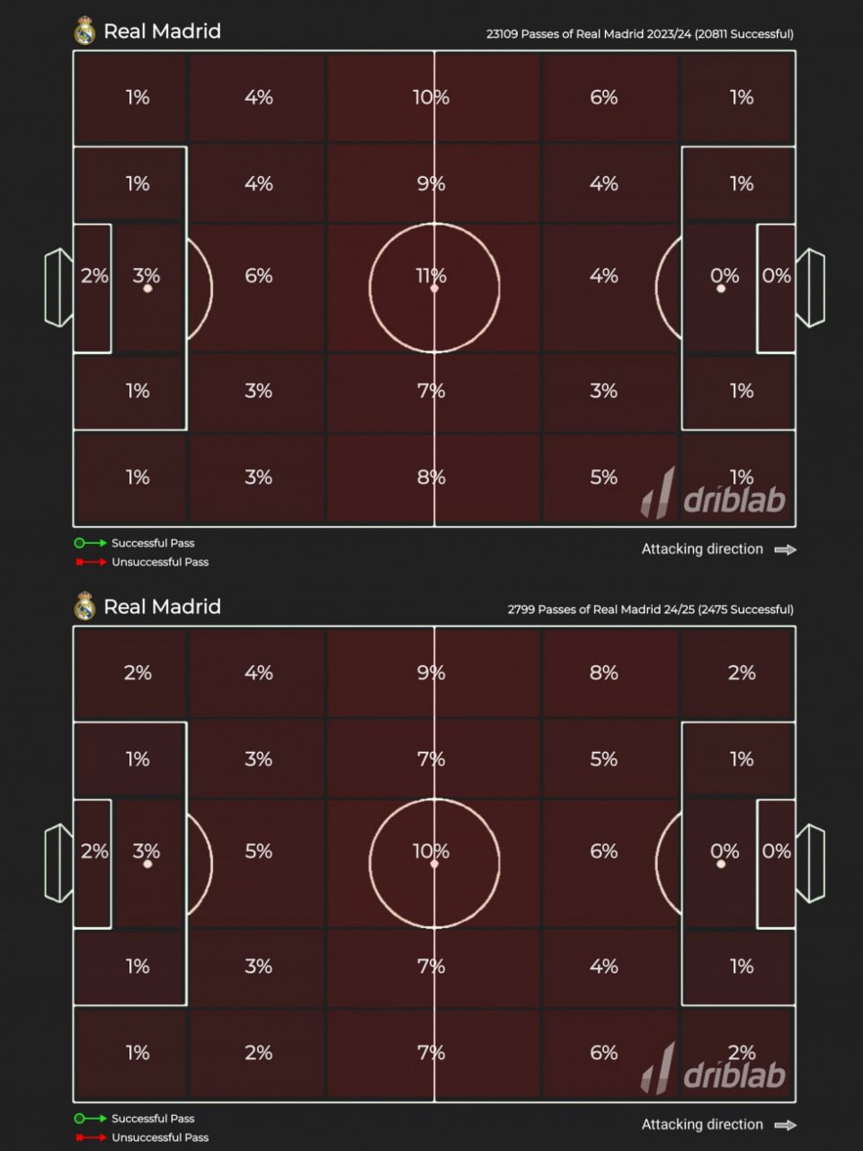 🛍 Если в прошлом сезоне 45% передач пришлись на вторую треть, то по ходу нынешнего процент упал до 40%. Вместе с тем возросла роль атакующих флангов/полуфлангов: ранее на их долю приходились 22% от всех передач Мадрида, теперь же 29%.