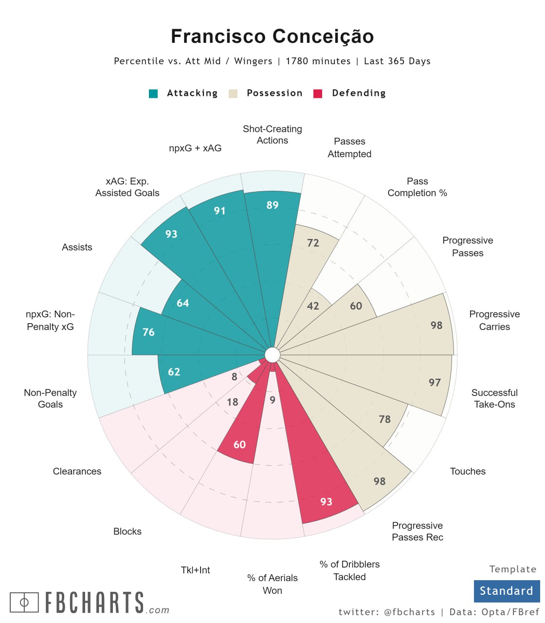 На дистанции в год Консейсау является одним из лучших дриблёров Старого Света. Шутка ли, весь базовый игровой арсенал техничного вингера Шику с лихвой закрывает своими действиями – везде перцентиль от 95-го: