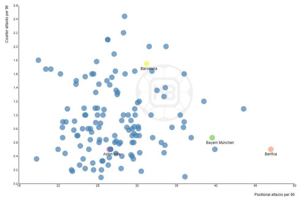 «Бенфика» Лаже – уже третий принципиально иной архетип клуба, встречающийся на пути Рекордмайстера в этой ЛЧ. Команда является европейским лидером по числу позиционных атак за игру (речь о топ-7 лигах) и шестой по PPDA (7.92, у «Баварии» 8.81). Тем не менее, казалось очевидным, что Бруну и К° не будут прощупывать такого соперника на предмет податливости в средне-низком блоке (его, собственно, и не было) и более того – «орлы» полностью готовы отдать на откуп сценарий матча. Но Венсан всё равно перестраховался.