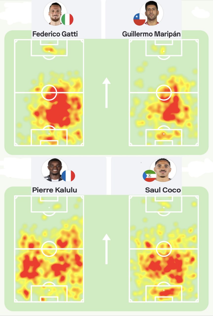 Калюлю прибавил ещё мощнее: соотношение перцентилей 99/93 (только вдумайтесь) + создание необходимой ширины и глубины как на мяче, так и без него. Схожий функционал и у Коко, что заметно по тепловым картам.