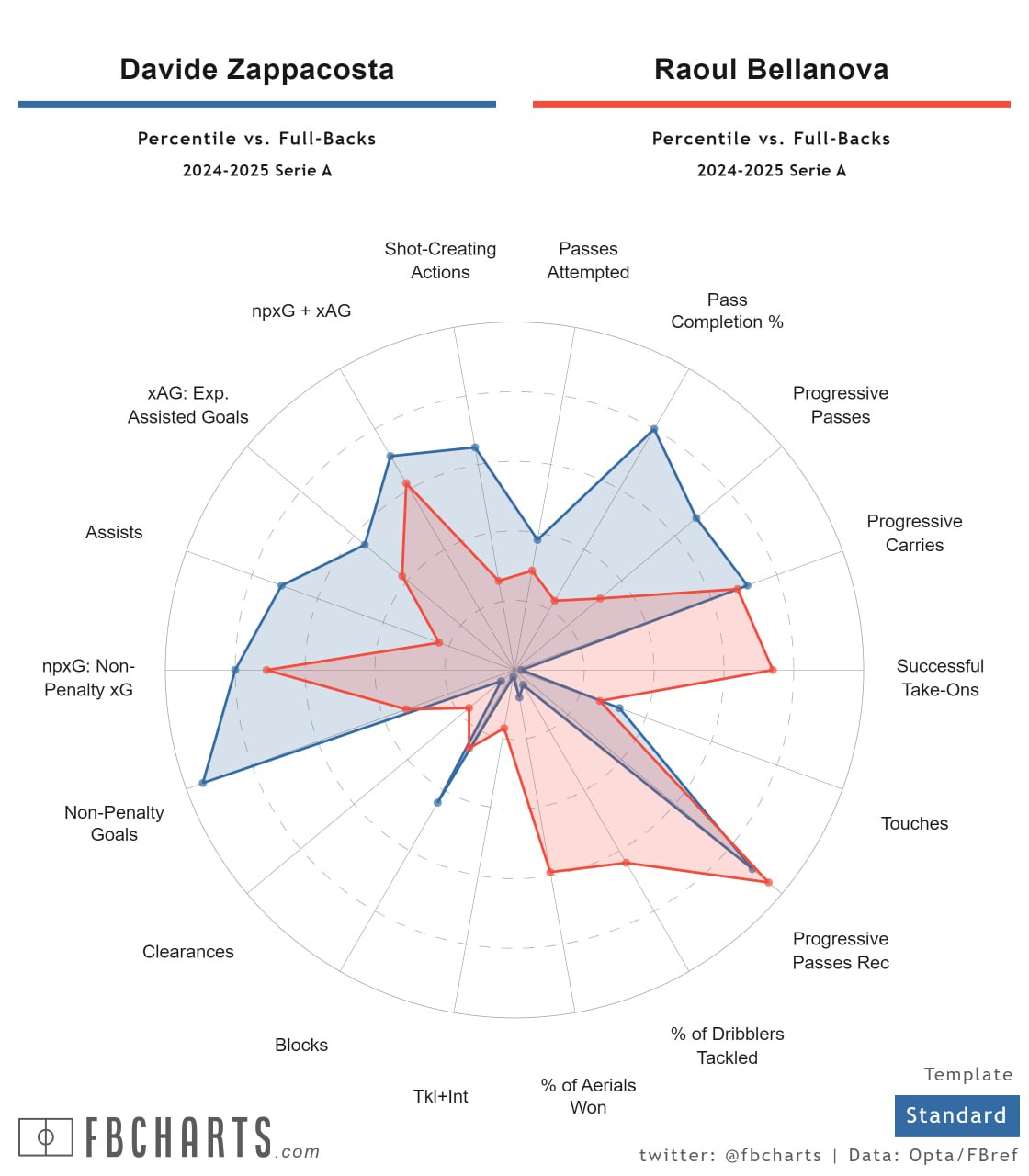 TFA подняли промежуточную статистику (Nov 2023 – Nov 2024) по Бастони, в очередной раз подсветив незаменимость Алессандро для нынешнего «Интера». Автор подошёл нестандартно, задействовав своеобразную и лишь отчасти релевантную выборку, включающую в себя центрбэков не только из элитного дивизиона, но и из Серии Б – специфический, но контекстно понятный ход, позволяющий ещё сильнее подчеркнуть атакоориентированность Бастони на фоне коллег по амплуа.