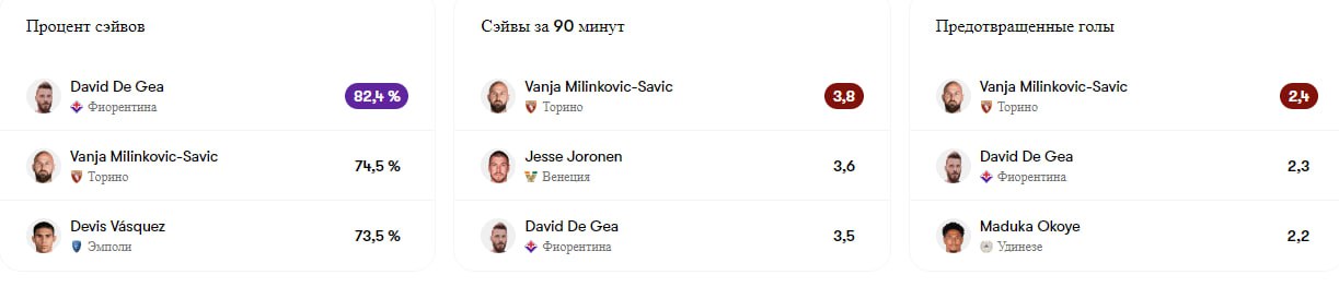 Отрыв Де Хеа от Вани по проценту сейвов стремительно ползёт к двузначному. Вместе с тем у серба на два матча больше, что, разумеется, наводит на закономерную мысль: на длинной, а главное равной дистанции вероятен не сценарий с ещё большим разрывом между киперами, а регрессия к среднему у испанца. Тем более у ВМС большее число сейвов p90 и несколько выше средний уровень соперников.
