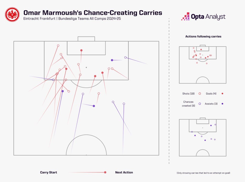 Характерно, что в сравнении с прошлым сезоном Мармуш куда чаще стал исполнять роль страйкера-плеймейкера. В розыгрыше 2023/24 египтянин провёл 85% игрового времени в амплуа чистой «девятки», изредка маяча на флангах. Теперь же, когда Топпмёллер видоизменил формацию, доведя её до 4-4-2 в билд-апе, требования к дуэту Мармуш/Экитике возросли: нападающие должны образовывать квадрат с вингерами, садясь так глубоко, как этого потребуют обстоятельства. Ныне Омар появляется слева 21% от общего времени, 11% проводит в роли АПЗ и лишь менее 70% на позиции наконечника.