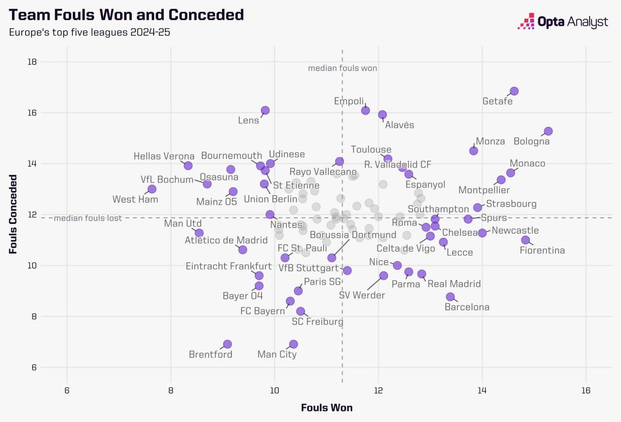 Общеевропейский топ по числу собранных на себе фолов возглавляют сразу две итальянские команды – «Болонья» страдает чаще всех (15,3 p90), а «Фиорентина» идёт следом (14,8 p90). В десятку также входит и «Монца».