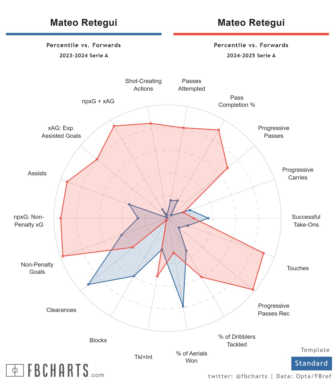 Как итог, Матео сделался более узкопрофильным, но ничуть не менее вовлечённым в командную работу. Например, откатились к минимуму метрики «глубокой обороны» (блоки и выносы), так как Ретеги попросту отсутствует в зоне этих действий, но вместе с тем никуда не делась работа без мяча: кратно увеличилась сумма успешных перехватов и отборов (tkl + int), а также число отборов на скорости.