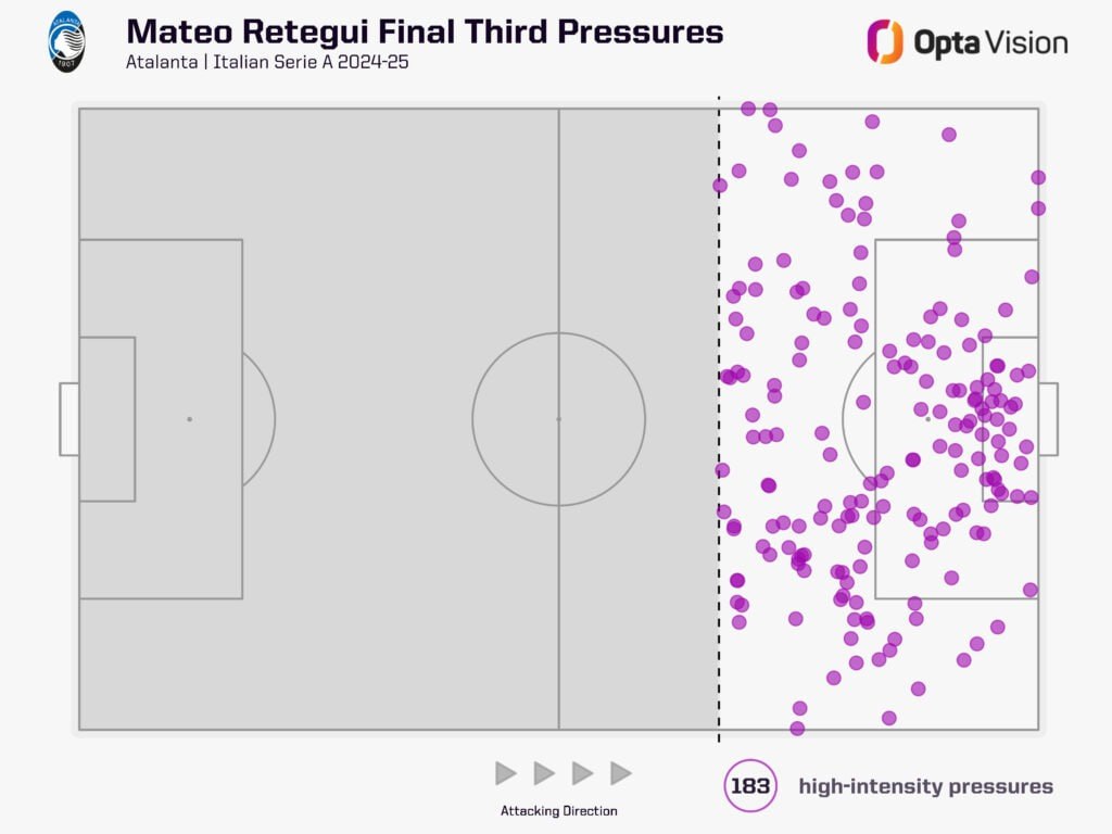 Речь в данном случае не о голах, а о работе в прессинге/контрпрессинге. Opta подсчитала, что у Ретеги набралось уже 183 попытки оказать давление на соперника в финальной трети – это, на секундочку, третий результат в Серии А. Характерно, что примерно треть из них пришлась на чужую штрафную и более 20-ти на вратарскую.