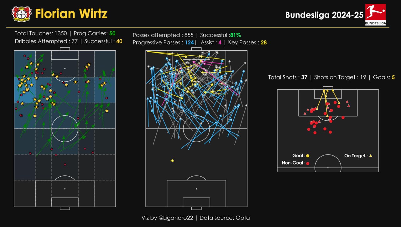 Кейс более чем показателен: при общем винрейте dribble duels в районе 52% Вирц, не имеющий в радиусе 4-5 метров более одного опекуна, выигрывает до 80%.