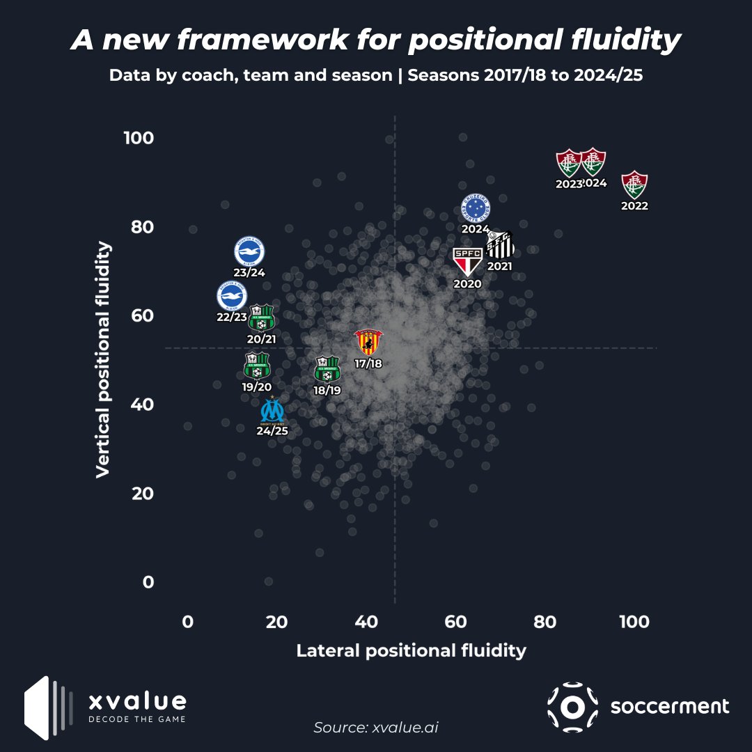 Soccermet разработал собственную метрику, изучающую адаптивность тренеров. Пока, впрочем, она не выглядит комплексно: в расчет берётся немаловажный, но лишь единственный параметр – т.н. Positional Fluidity (или же позиционная гибкость). Её суть заключается в оценке способности игрока двигаться между ролями или зонами, сохраняя при этом полезность и эффективность для своей команды. Главная загадка лично для меня – комбинацией из каких показателей мерится вышеупомянутая полезность. EPV, OBV, xT или же в выборку включены не только нон-шоты?