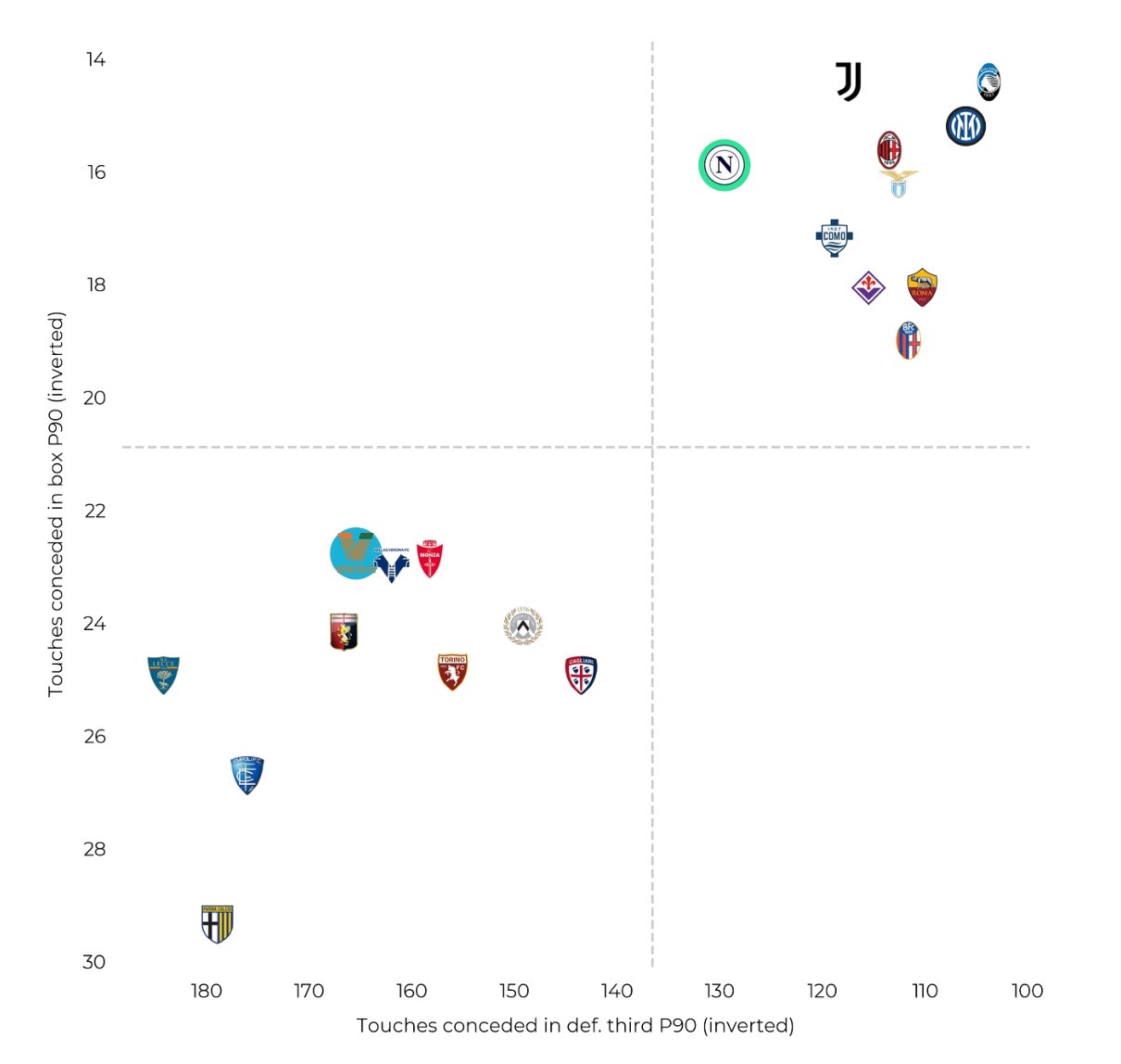 Франческо же обратил внимание на то, что невезение команды не ограничивается одним только слабым выхлопом у чужих ворот: «Комо» многовато пропускает, контролируя, казалось бы, входы в опасный радиус у своей штрафной. Соперники касаются мяча в защитной трети «озёрных» менее 120 раз за игру – это, для понимания, немногим более, чем у «Ювентуса». Касательно уровня допущений в самой штрафной, на бумаге ситуация ещё лучше. Парни Фабрегаса идут седьмыми в лиге по слаженности действий у своих ворот (менее 18 касаний соперника p90), что ставит их даже выше «Фиорентины».