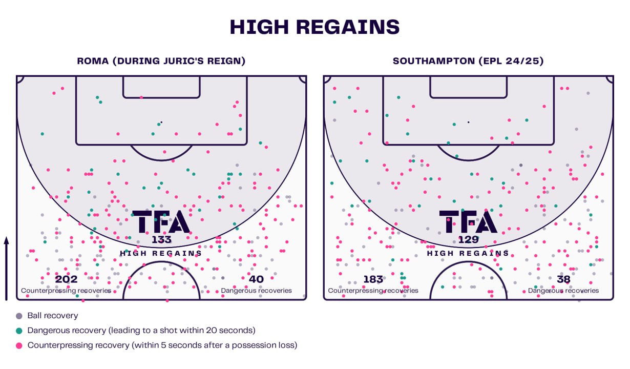 Даже абсолютно неприспособленная (и необучаемая) к структурному прессингу «Рома» добилась при Юриче больших успехов как в игре через зональное давление, так в переходных фазах. За 12 игр при хорвате «волки» достигли отметки в 202 возврата в первые пять секунд после потери мяча. Показатели контрпрессинга «Сотона» даже за 17 игр куда скромнее – лишь 187.