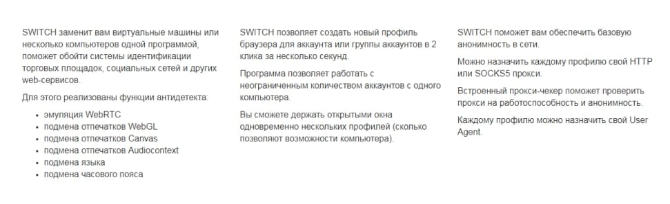 Switch — антидетект браузер на основе Chromium для ведения мультиаккаунтов в соцсетях, на форумах, торговых площадках, других сайтах и т.д.