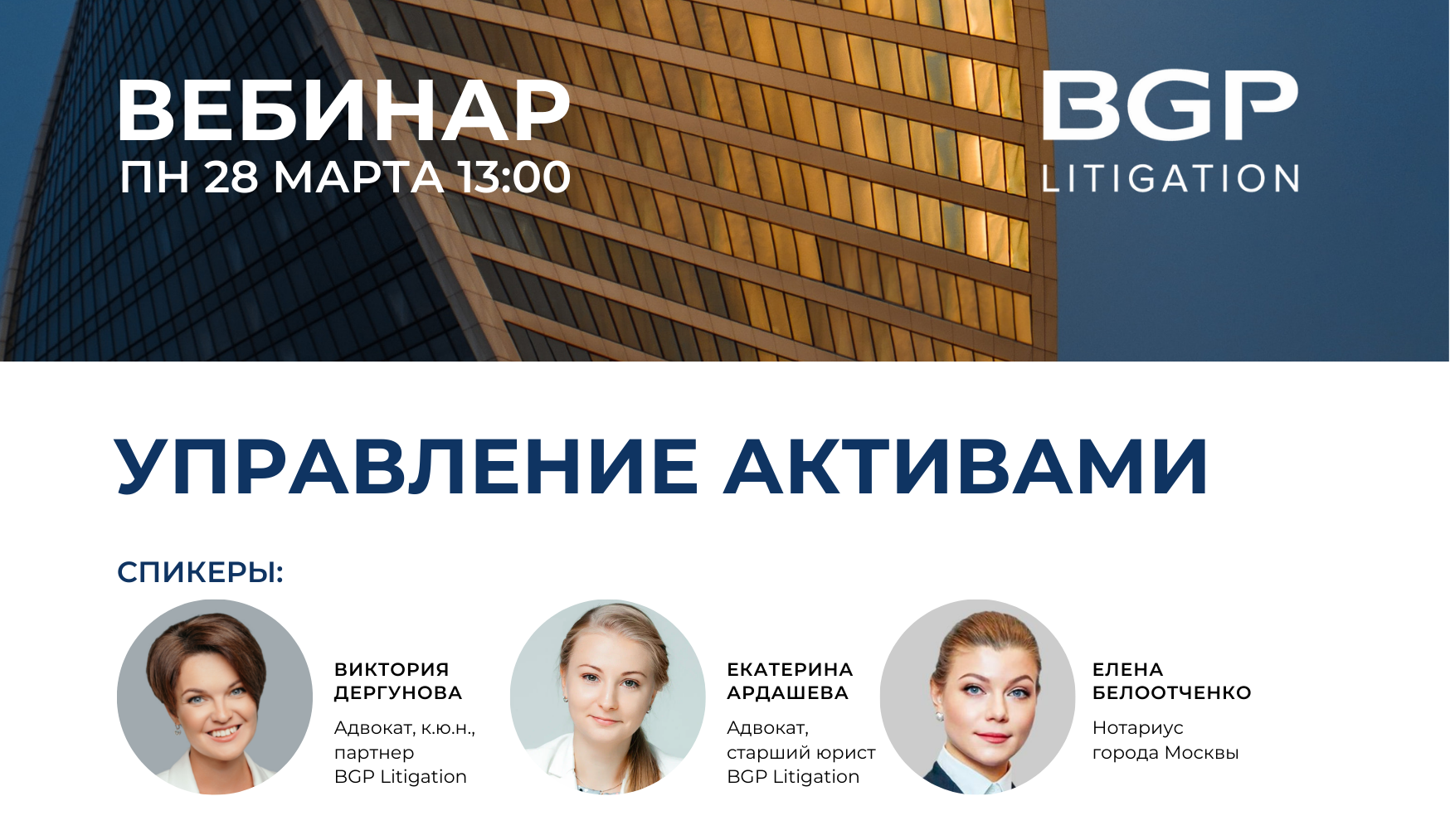Коллеги, уже в понедельник эксперты BGP Litigation Виктория Дергунова и Екатерина Ардашева совместно с нотариусом Еленой Белоотченко расскажут на вебинаре о возможных способах управления активами в России.
