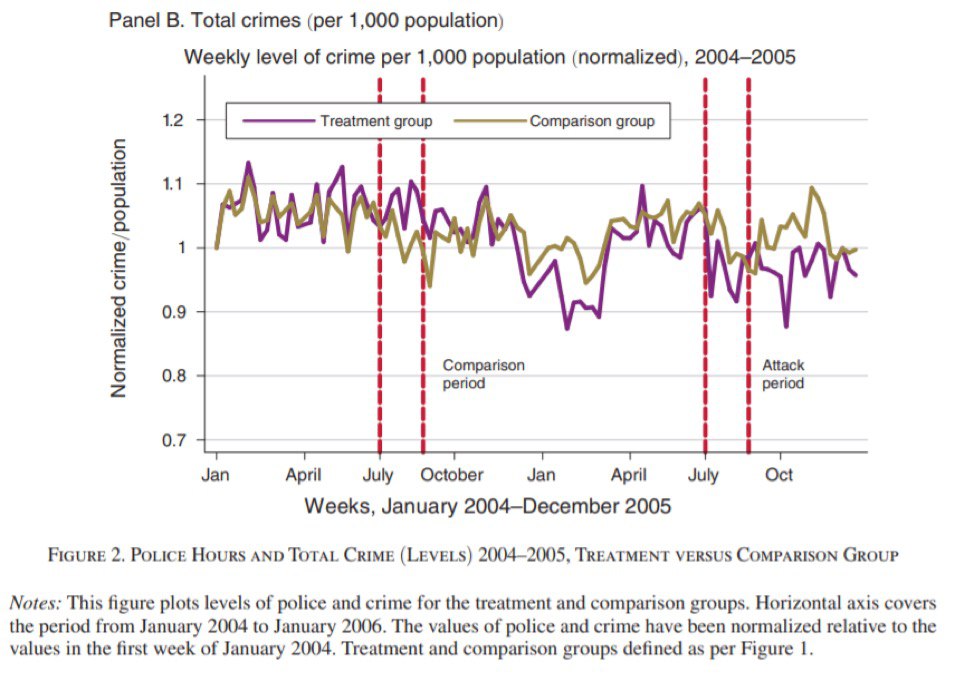 Часто помогают натуральные эксперименты. Например, летом 2005 года в центре Лондона было несколько терактов, и мэрия на несколько недель увеличила концентрацию полицейских, но только в некоторых центральных районах. Mirko, Machin и Witt использовали эти географические и временные рамки с увеличением полиции в своём исследовании и рассчитали, что 10% увеличение в концентрации полиции снижает преступность на 3–4%. Правда, есть вопросы к внешней валидности: будет ли такой же результат без теракта и/или в другом городе или стране? Может быть, просто преступники, как и обычные люди, старались не появляться в центре и поэтому там было меньше преступлений? Авторы пытаются проконтролировать это через пассажиропоток метро, но остаются сомнения, достаточно ли этого.
