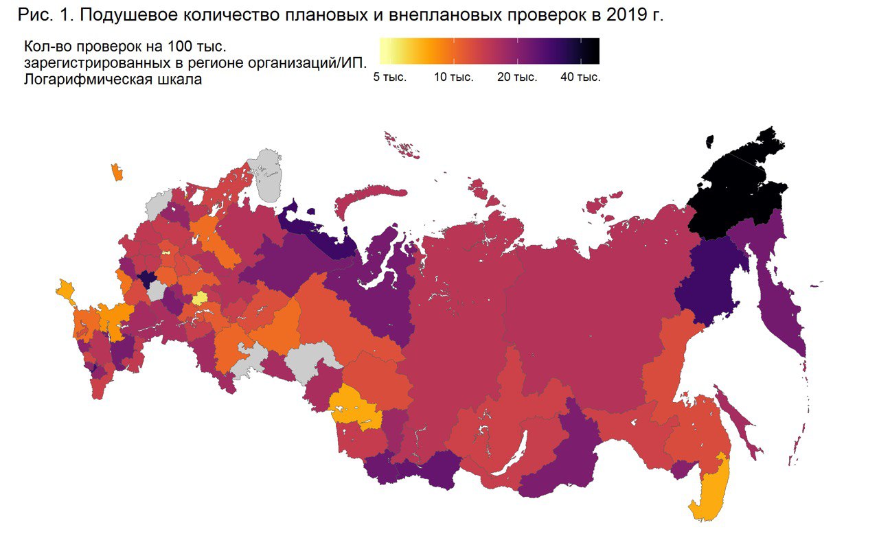 Мы проанализировали данные о проверочной деятельности контрольно-надзорных органов в России за 2010–2019 гг. Мы использовали данные внеплановых проверок Единого реестра проверок (2018–2019 гг.), данные плановых проверок, собранные с сайтов прокуратур (2010–2019 гг.), открытые данные отчётности контрольно-надзорных органов ГАС «Управление» (форма 1-Контроль). К этому мы добавили данные официальных реестров юрлиц (ЕГРЮЛ) и ИП (ЕГРИП), а также данные финансовой отчетности предприятий Росстата за 2017 г.