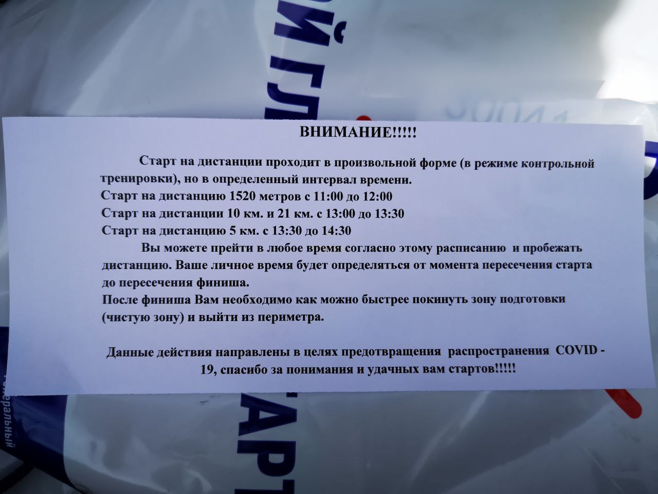 Самое же забавное, что никакой это не забег, а контрольная тренировка, о чём сообщает соответствующее объявление (на орфографию не обращай внимания). Довольно странное решение, учитывая глобальный масштаб ("самый массовый полумарафон") мероприятия.