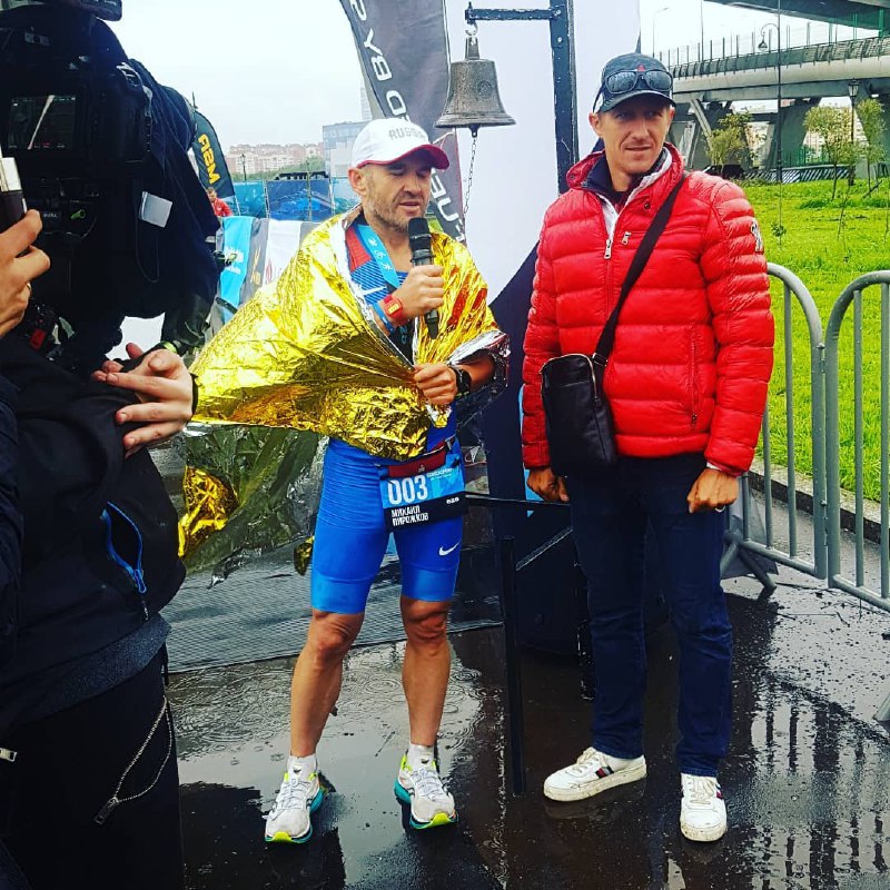 Михаилу Пирожкову 54 года, к середине второго дня он уже «кинул» ближайшим преследователям больше часа (а дистанция сегодня на велосипеде 300 км, если что). Лучший результат Пирожкова на дистанции Ironman - 9 часов 49 минут.