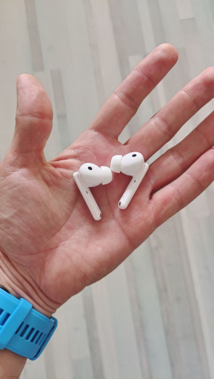 Начну с внешнего вида – это вкладыши с «ножкой», небольшого размера и веса (всего 5,5 г каждый). Благодаря сменным амбушюрам можно добиться идеальной посадки. И на пробежке они не выскакивают из ушей.