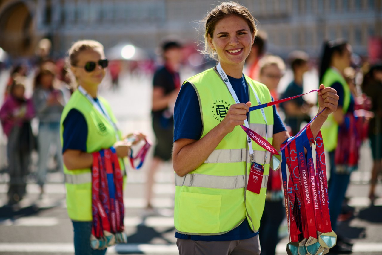 Сегодня волонтёры помогают участникам и гостям сориентироваться на Дворцовой площади. Они ассистируют на старте, заботятся об участниках на пунктах питания и освежения, а на финише вручают медали, выдают воду и фрукты. Также волонтёры работают с элитными спортсменами, в команде хронометража и режиссёрской группе. Первую медицинскую помощь на финише готовы оказать волонтеры-медики.