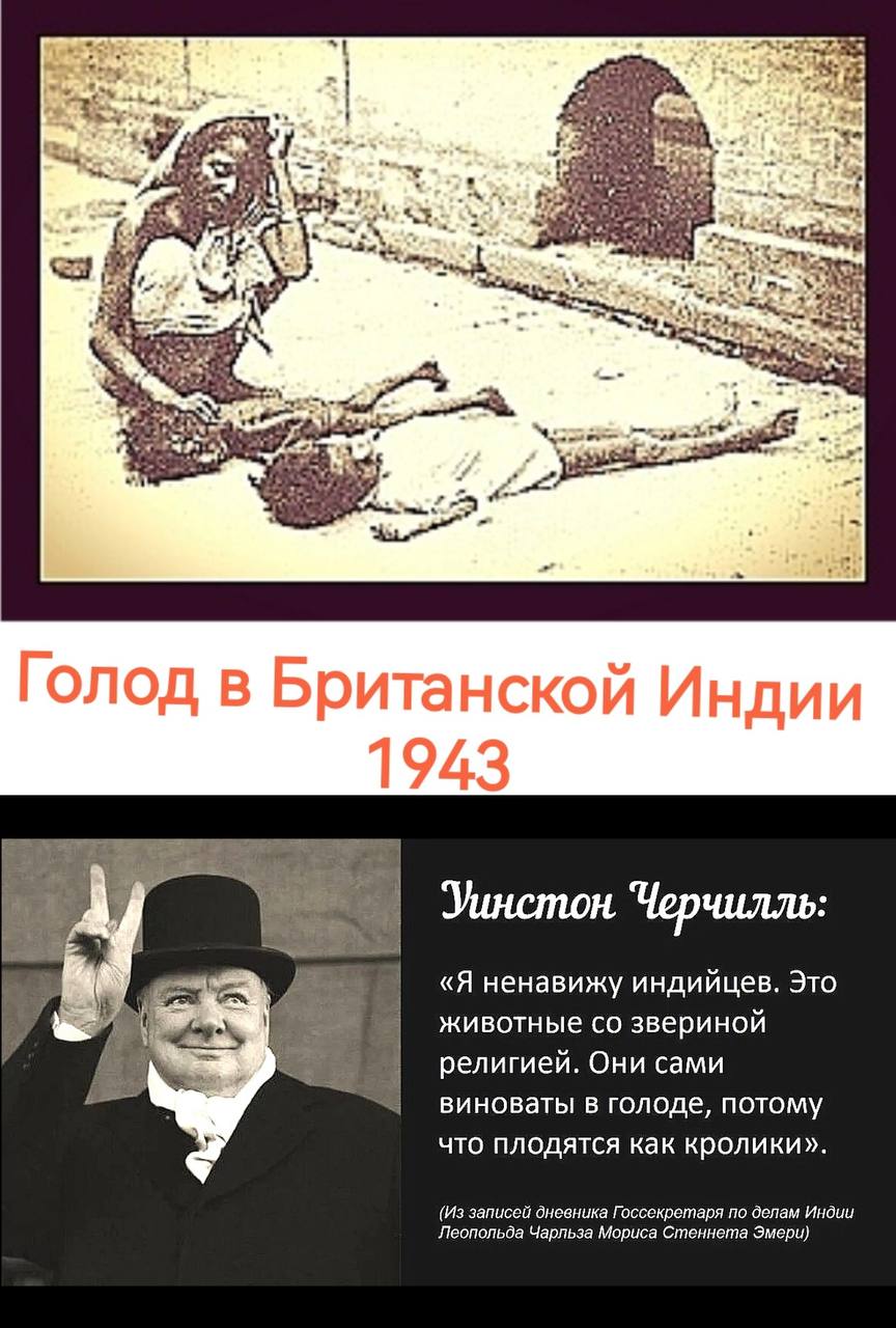80 лет назад в 1943 в британской колонии на индийской земле вспыхнул очередной страшный голод. Среди его причин - хищнический вывоз продуктов из индийской колонии в британскую метрополию. Тогда в одной лишь провинции Бенгалия от голода погибли миллионы! Британский премьер тех лет У. Черчиль цинично заметил: "Я ненавижу индийцев. Это животные со звериной религией. Они сами виноваты в голоде, потому что плодятся как кролики".
