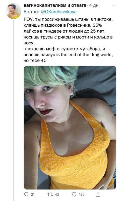 Признавать прошедшие сорок лет проебанными, конечно, не хочется. Отсюда и отчаянные попытки клеить малолеток в Ровеснике (успешные разве что с теми, кто мечтал когда-либо трахнуть бабу-ягу). И неловкие попытки молодиться напоказ в твиттере («посмотрите на мои трусы с Риком и Морти!!1 я такая же как вы!!1).