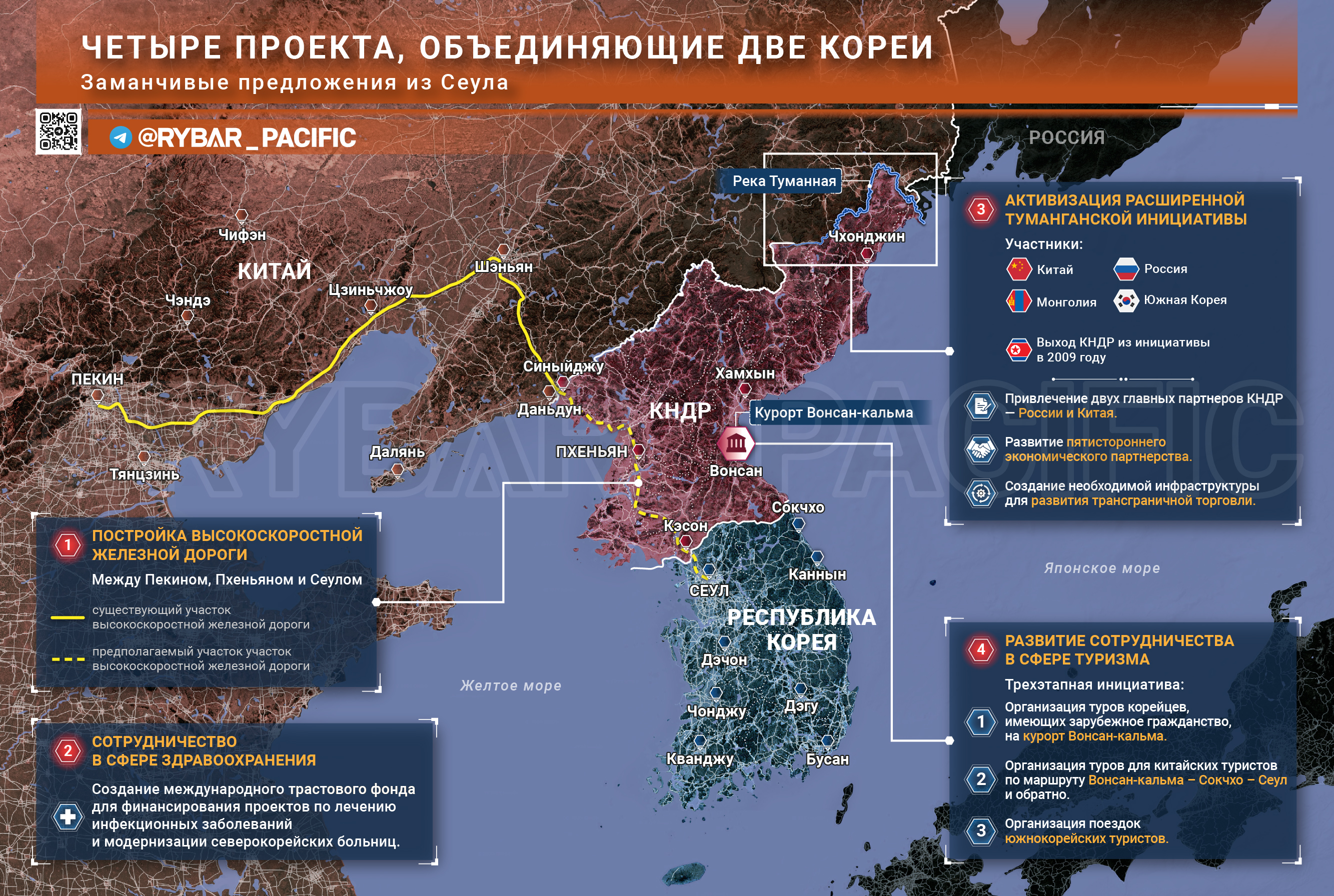 Среди них постройка высокоскоростных ж/д путей по маршруту Сеул-Пхеньян-Пекин, развитие туризма на северокорейском курорте Вонсан-Кальма и гуманитарный проект, направленный в том числе на модернизацию больниц в Северной Корее.
