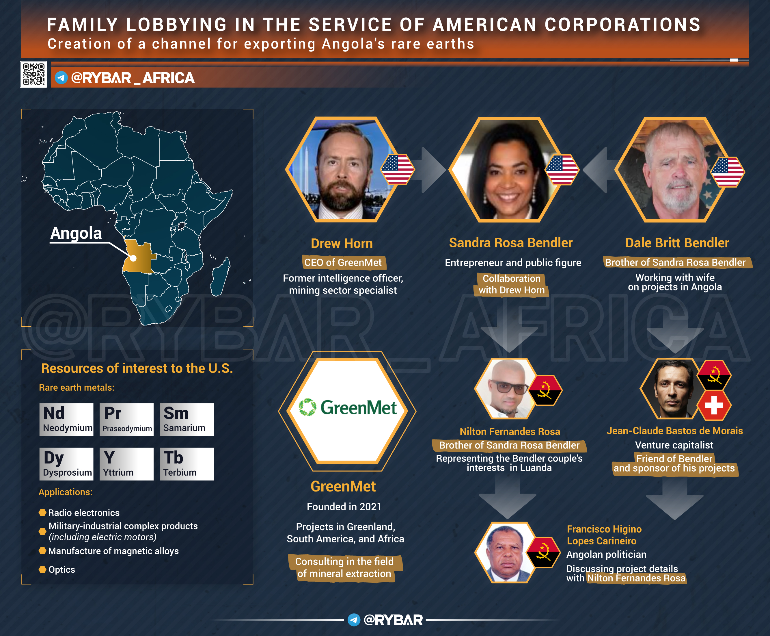 Он смог создать новый канал вывоза редкоземельных металлов из Анголы раньше, чем мечтающие об этом олигархи из команды Трампа. Помогла ему в этом жена — уроженка Анголы Сандра Роза Бендлер, с которой он познакомился, работая в местной резидентуре ЦРУ.