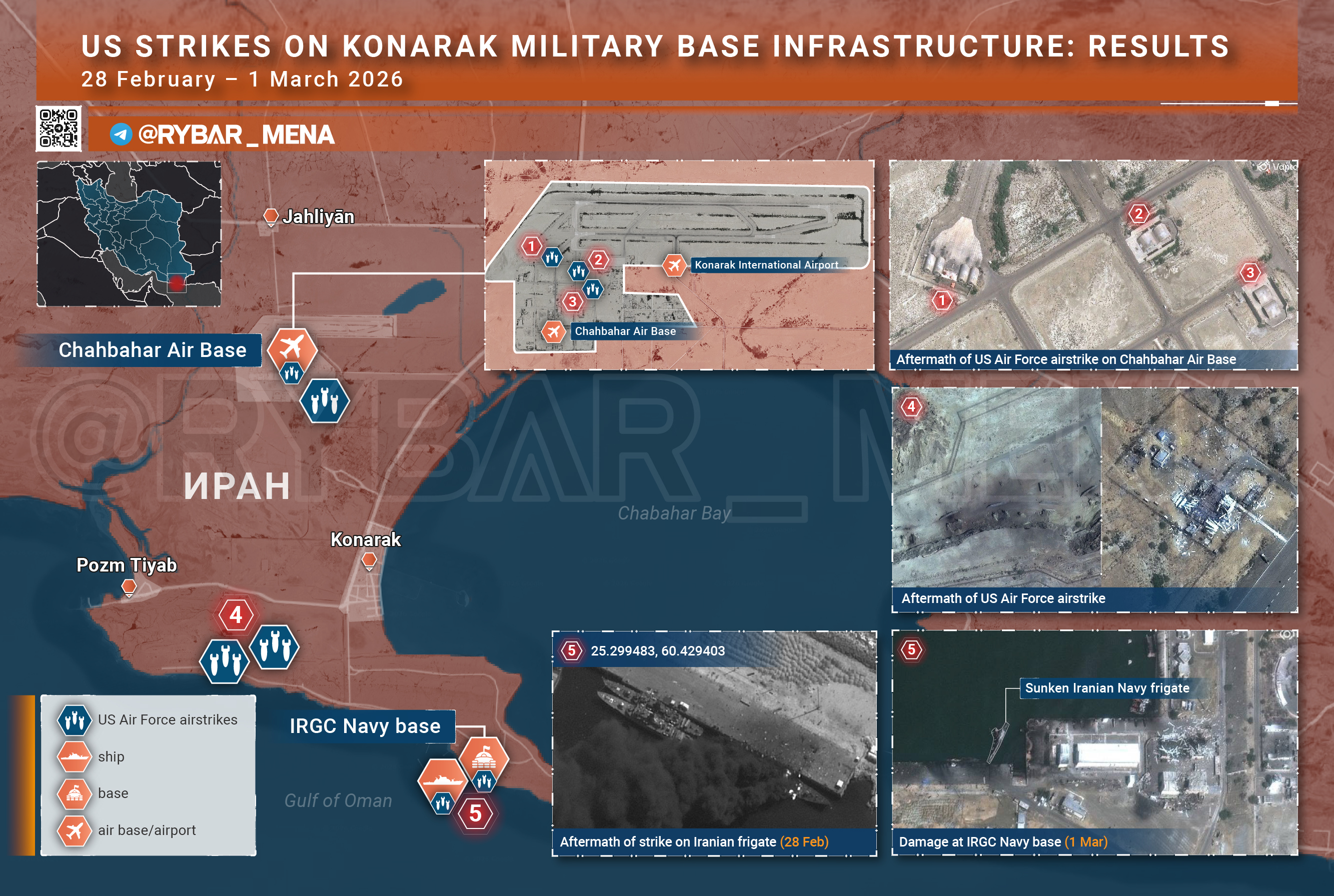 Еще в первый день операции США появились кадры с последствиями авиаудара США по порту в Конараке, а теперь их стало больше. Разрушения на базе и прилегающей инфраструктуре намного масштабнее, чем в первый день, досталось и соседней авиабазе.