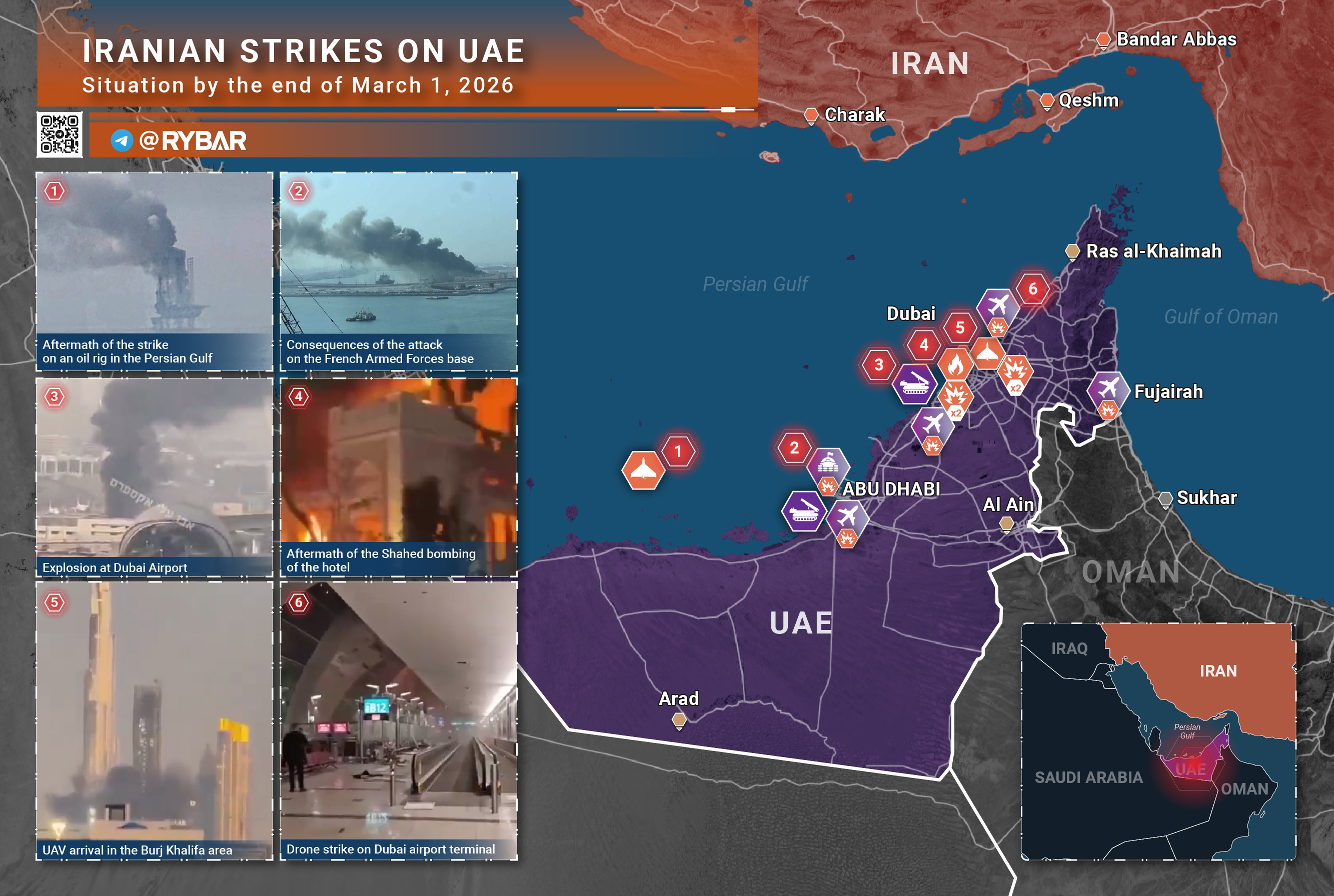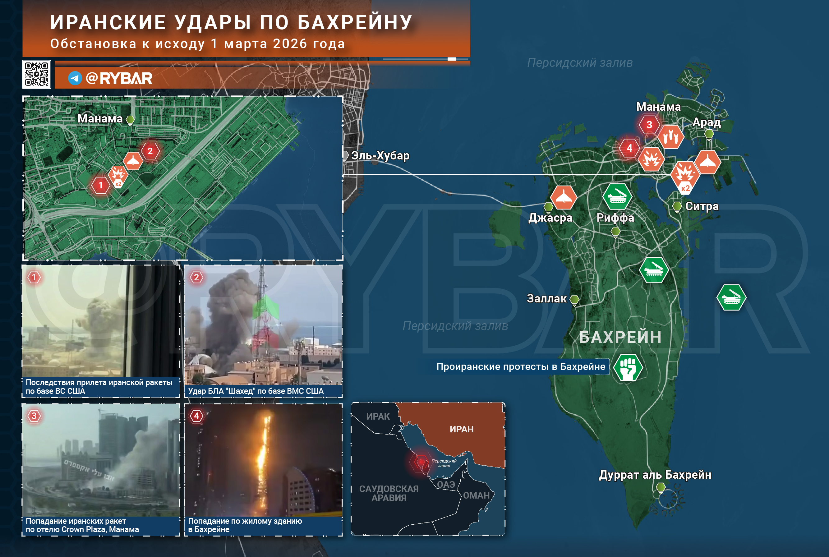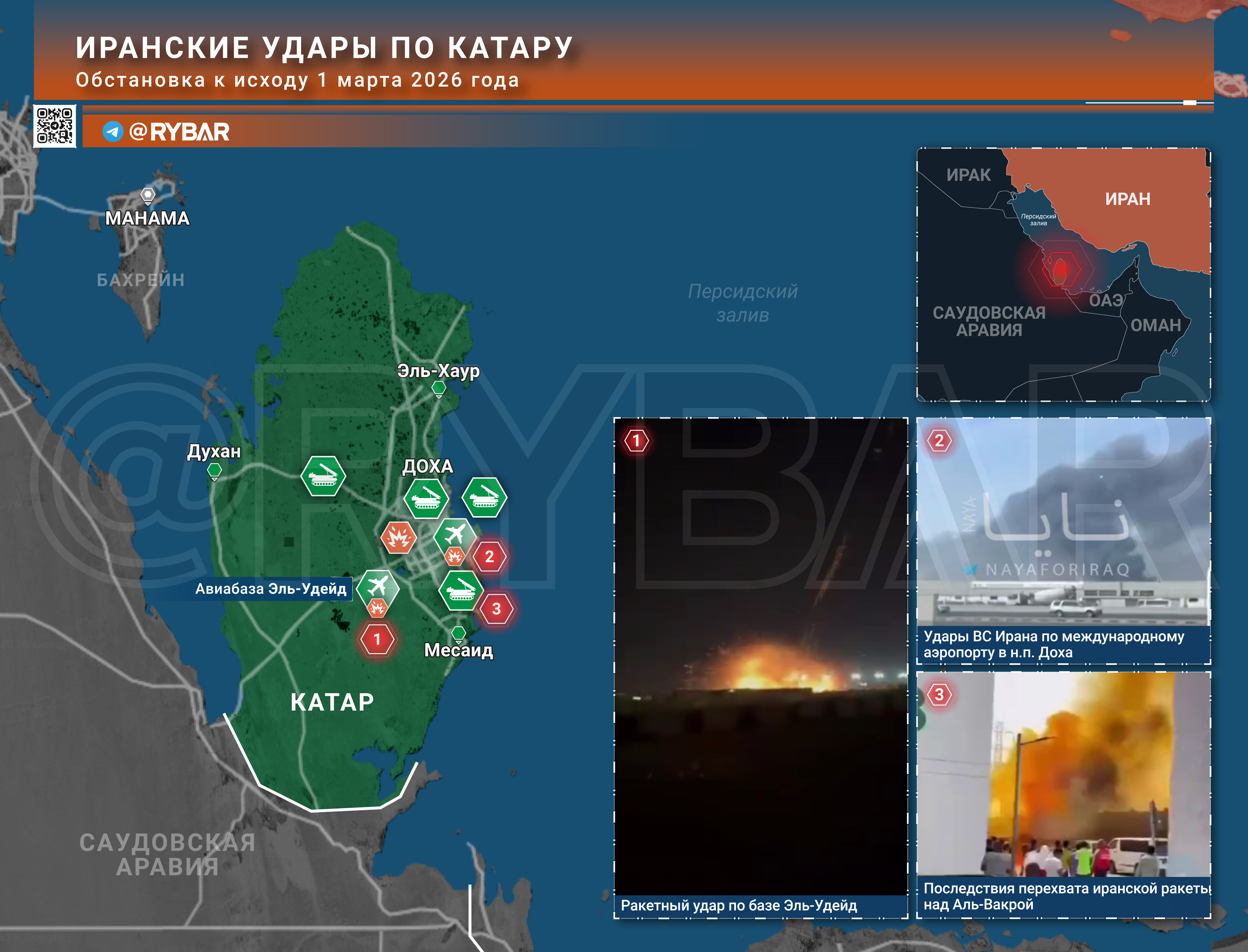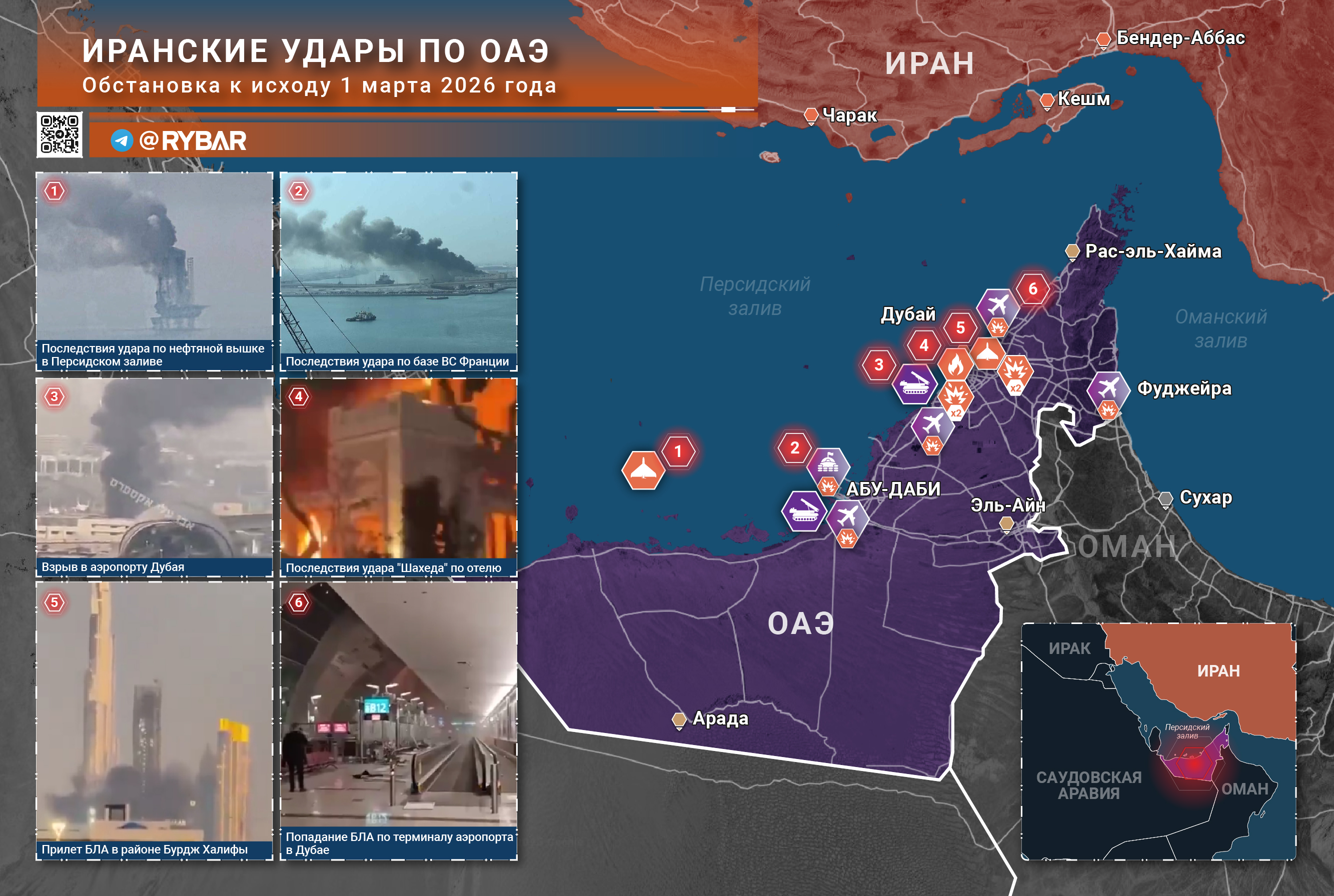 ➡️В ночь на первое марта ударам подвергся международный аэропорт Дубая, был подожжен Бурдж аль-Араб. Множественным ударам подверглась Доха, не обошли стороной Бахрейн, где со вчерашнего дня продолжается возгорание и пострадали американцы. Впервые за время конфликта удару подвергся самый нейтральный в регионе Оман. Были и сообщения об ударе по Кипру, впрочем, впоследствии опровергнутые.