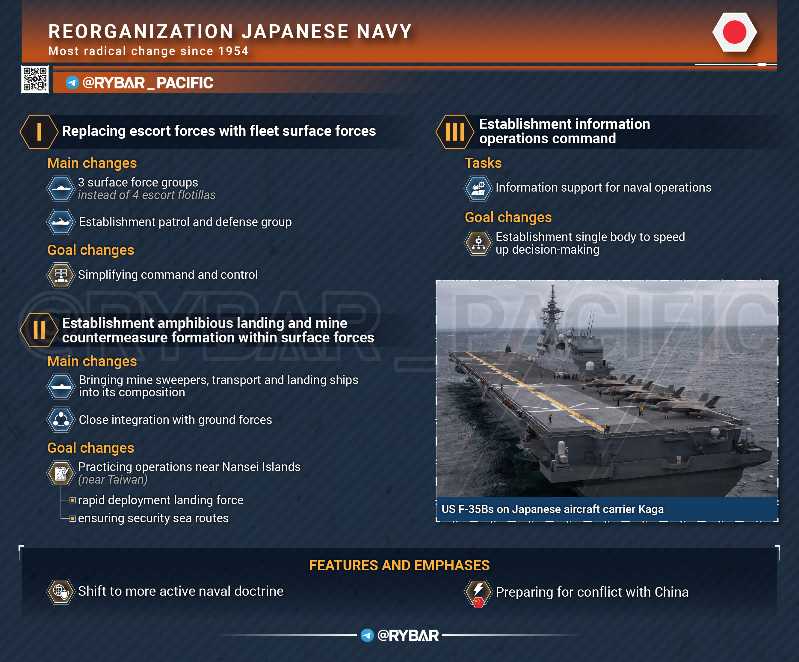 🔻 Как еще изменился японский флот?▪️ Также в рамках флота создано командование информационных операций. Оно возьмёт на себя задачи разведки, проведения киберопераций, организации связи и другие.▪️ Ещё одним серьёзным изменением стало создание нового соединения амфибийно-десантных и минно-тральных сил, базирующего в Сацэбо. Его работа будет интегрирована с деятельностью амфибийной бригады быстрого развёртывания сухопутных сил самообороны — это формирование ответственно за десантные операции.
