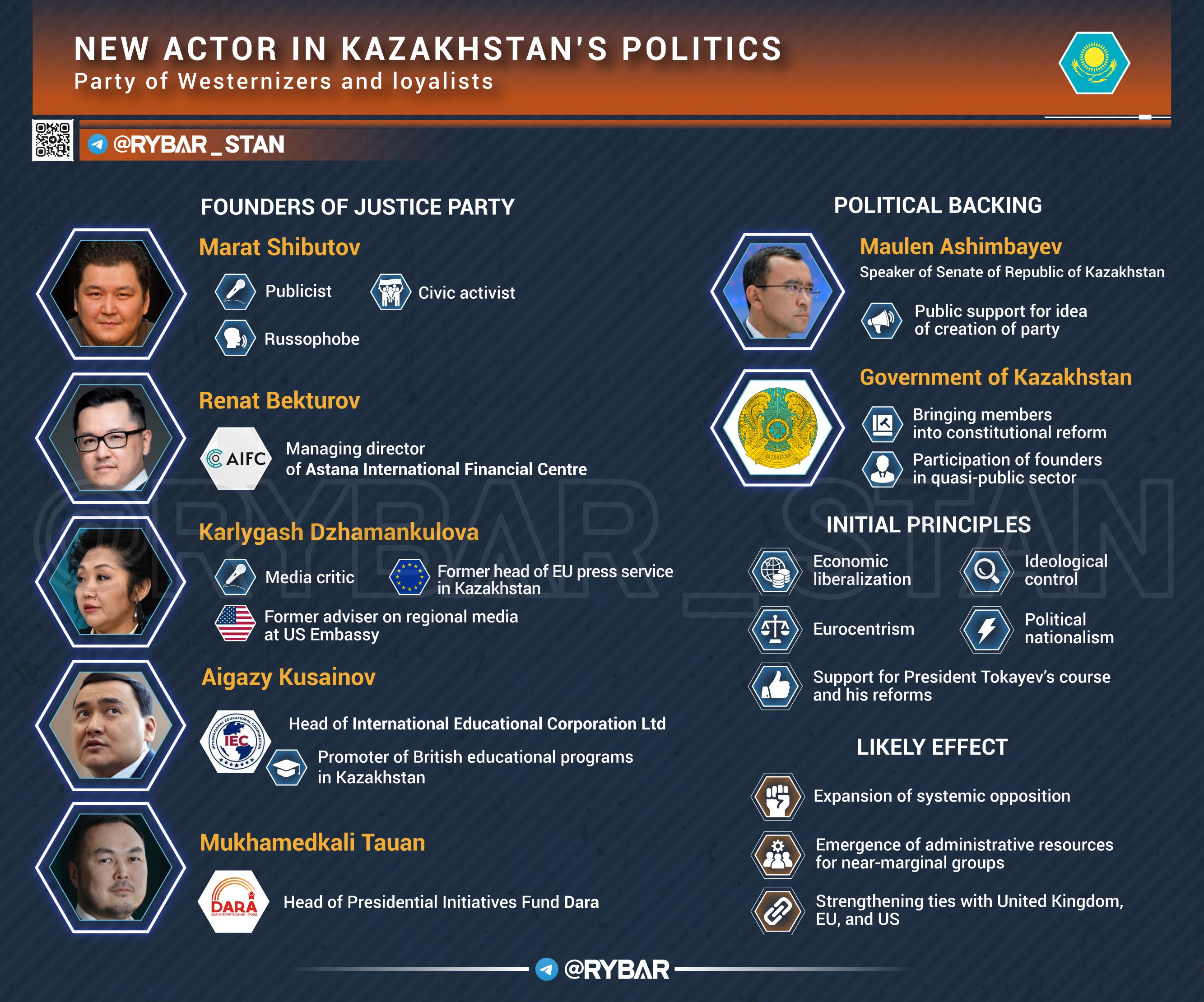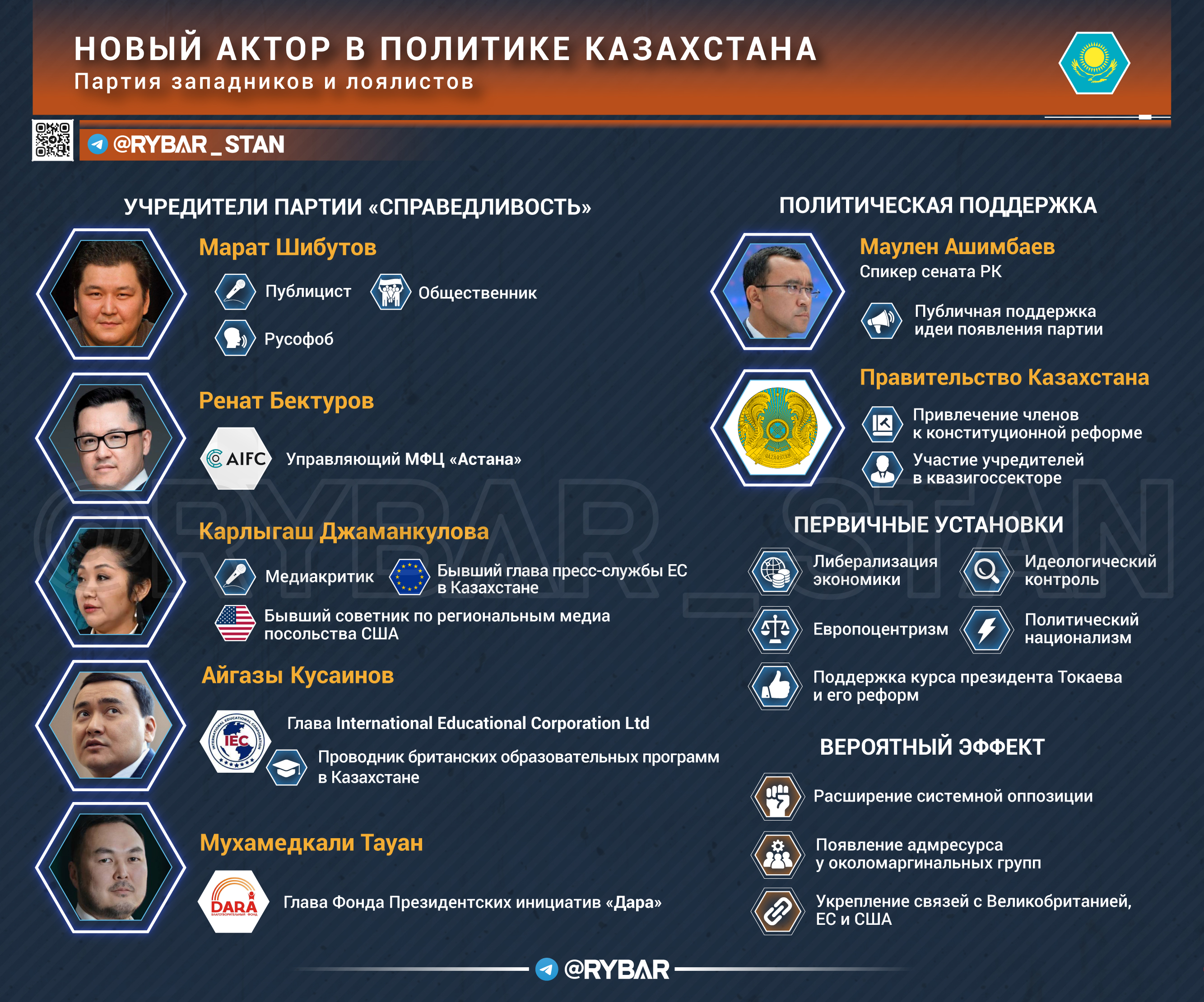 🔻 О ком именно речь➡️ Идеологом движения стал известный антироссийскими высказываниями публицист Марат Шибутов. Его амбиции подогревает поддержка властей, с подачи которых он участвовал в разработке действующей конституции. Выступает за политическую цензуру в Казахстане.➡️ Среди инициаторов числится и Карлыгаш Джаманкулова — выходец из посольства США, где работала советником по региональным медиа, а также бывшая глава пресс-службы представительства ЕС в Казахстане.➡️ Заметной фигурой является и Айгазы Кусаинов — директор International Educational Corporation Ltd., деятельность которой связана с образовательной сферой и продвижением в ней британских стандартов.➡️ В списке авторов инициативы есть и те, кто уже обладает административным ресурсом. Например, это управляющий Международным финансовым центром «Астана» Ренат Бектуров.➡️ Кроме него, соавтором числится Мухамедкали Тауан — глава Фонда президентских инициатив «Дара».