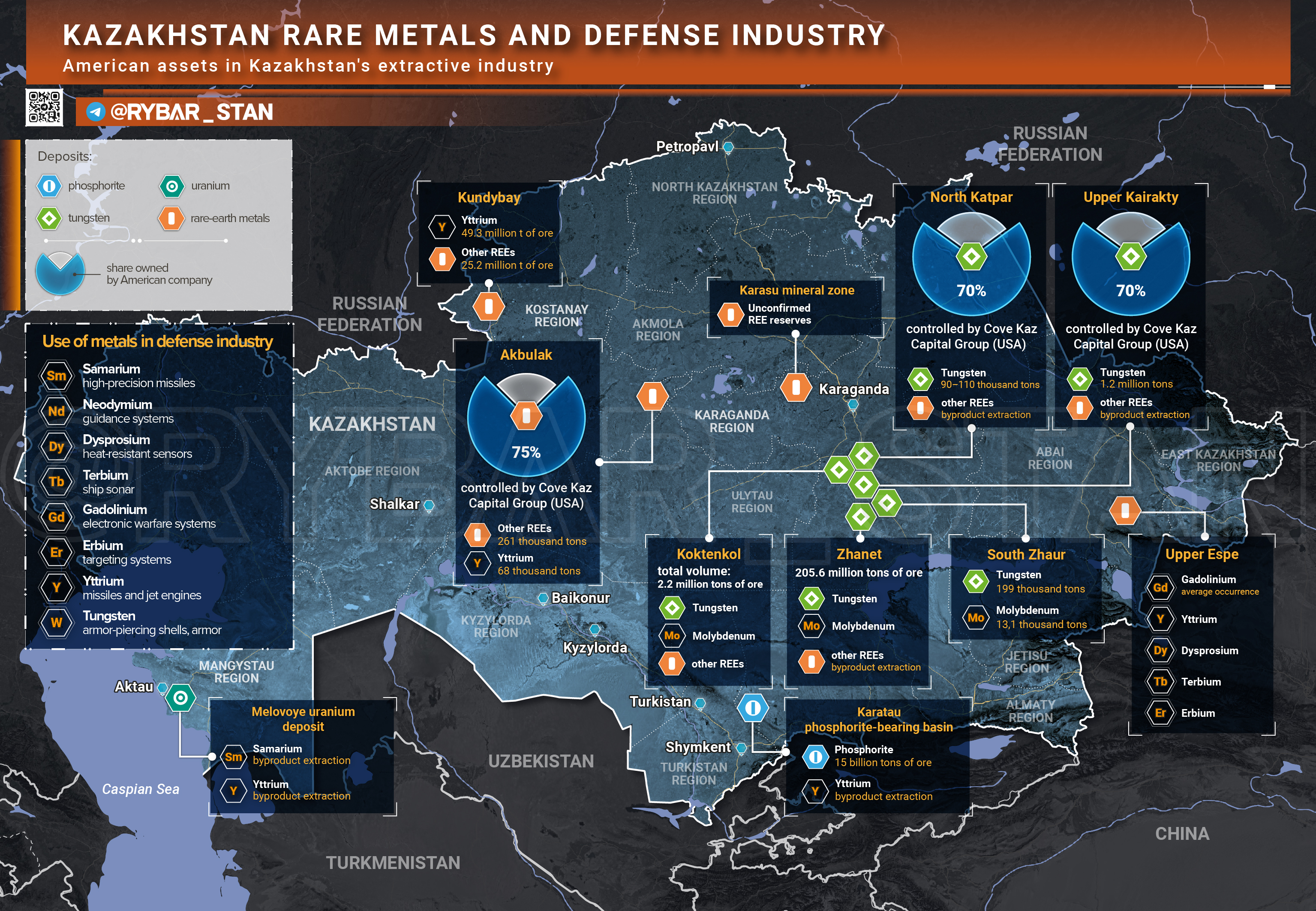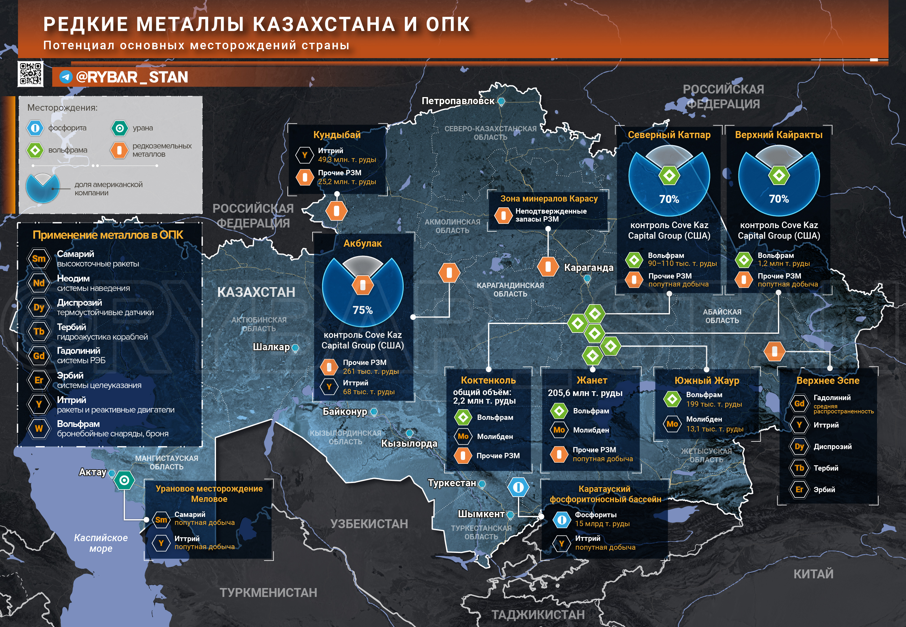 🔻 Где нужен казахский редкозём?➡️ Хотя большая часть информации о месторождениях РЗМ в Казахстане остаётся закрытой, для привлечения инвесторов обозначены несколько зон, где есть руда с содержанием редких металлов.➡️ Среди них выделяются расположенные в центре страны вольфрам-молибденовые месторождения Коктенколь, Жанет и Южный Жаур. Однако там добыча редких металлов является попутной, а их запасы, как и в случае с минеральной зоной Карасу на севере, не подтверждены.➡️ Иная ситуация с месторождением Кундыбай в Костанайской области, где, по оценке, находится около 49 млн т руды иттрия. Этот элемент крайне полезен при производстве ракет и реактивных двигателей. Попутным путём металл можно добыть и в Каратауском фосфоритном бассейне на юге Казахстана.➡️ Но далеко не все месторождения концентрируют большие запасы РЗМ. Например, Верхнее Эспе в Восточном Казахстане содержит важный при изготовлении систем РЭБ гадолиний. Однако его распространённость там оценивается как средняя.➡️ Кроме того, многие из редких металлов в Казахстане можно попутно добывать на месторождениях урана. Примером является месторождение Меловое, где потенциально можно встретить самарий. Без него не обойтись при создании систем наведения для ракет Tomahawk.➡️ Не стоит забывать и про вольфрам, который, хоть и не является редкозёмом, очень полезен при создании бронебойных снарядов и композитной брони.➡️ На днях власти Казахстана окончательно передали 70%-ю долю американской Capital Group на два крупных месторождения вольфрама — Северный Катпар и Верхний Кайраты. Не исключено, что там также могут содержаться другие элементы.➡️ Также эта компания на 75% контролирует добычу на месторождении Акбулак, богатом иттрием и другими РЗМ. В общем, освоение казахских недр идёт полным ходом.