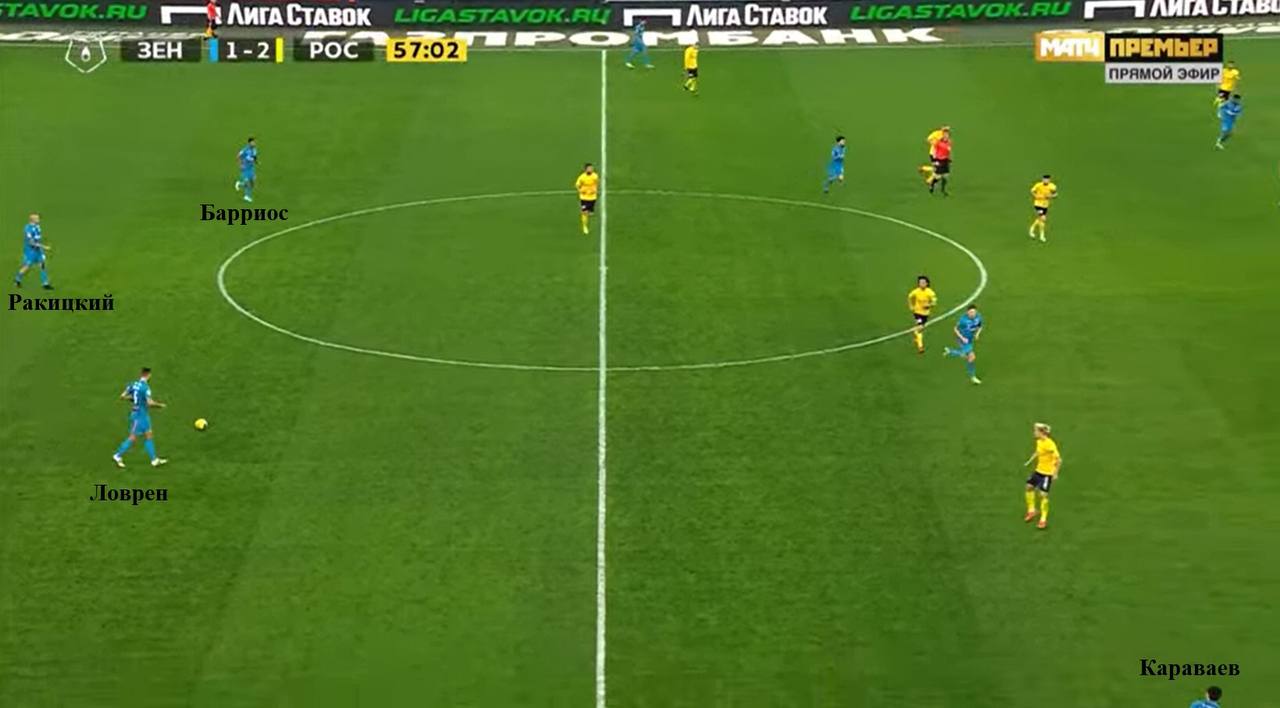 Обычно, когда Зенит играл с двумя центральными защитниками, при переходе из обороны в атаку на одну линию с ними опускался Барриос, тем самым давая возможность обоим крайним защитникам высоко подниматься. На этот раз не было Барриоса, на одной линией с ЦЗ играл Караваев, из-за чего он так редко принимал участие в доставке мяча до финальной трети. Вячеслав поднимался выше, только когда к ЦЗ опускался Кузяев, или атака развивалась уж около штрафной Ростова.